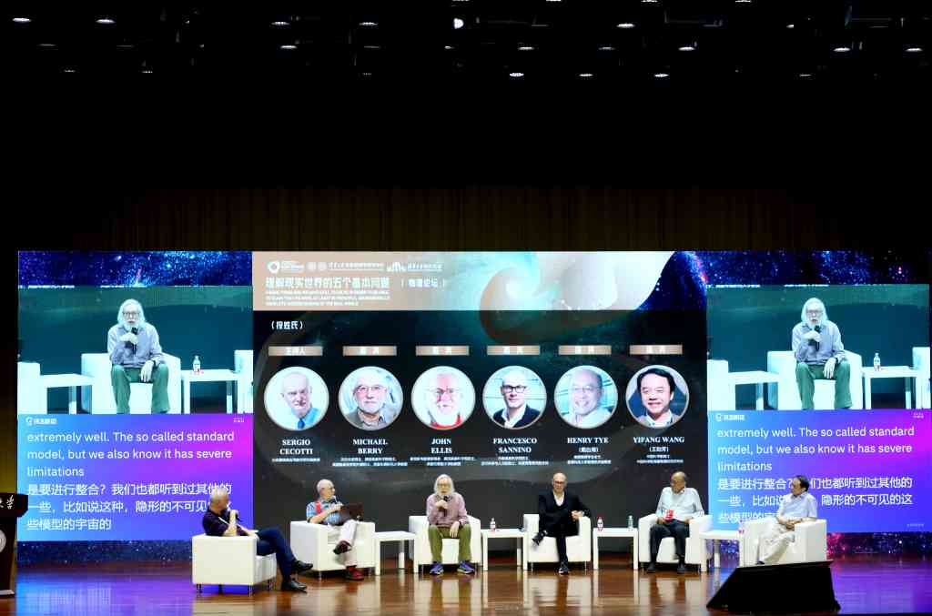 “理解现实世界的五个基本问题”物理论坛由切科蒂主持,嘉宾们探讨了“基本运行原理的底层图景”“问题可解决性的边界”“下一个物理大发现”“年轻物理学者的研究课题选择与职业生涯”等话题。关于对现实世界物理规律的理解,埃利斯表示,宇宙的大部分是暗物质,这是人类尚未理解的领域,可能需要扩展目前的物理原理,寻找某种统一物理学的理论;贝里则认为人类在宇宙中的存在只是一瞬,科学研究的历史更是短暂,数学与物理不断涌现新概念,即使人类终结,也难以见到尽头。针对下一个物理大发现,桑尼诺表示对找到新的基本粒子充满期待,希望Higgs粒子并非最基本的粒子,而其中仍存在新世界,这将可能产生新的力,甚至可能解释暗物质;王贻芳阐述了近几十年可能会解决的三个问题,首先是中微子的CP phase,其次是Higgs粒子,或将成为通向未来研究的窗口,最后是宇宙膨胀的验证。对于年轻学者的职业规划,戴自海认为,最重要的是要找到自己喜欢、好奇的研究方向,并全身心地投入其中,当前中国正在进行许多新的物理项目和观测实验,年轻人有很大的选择余地。