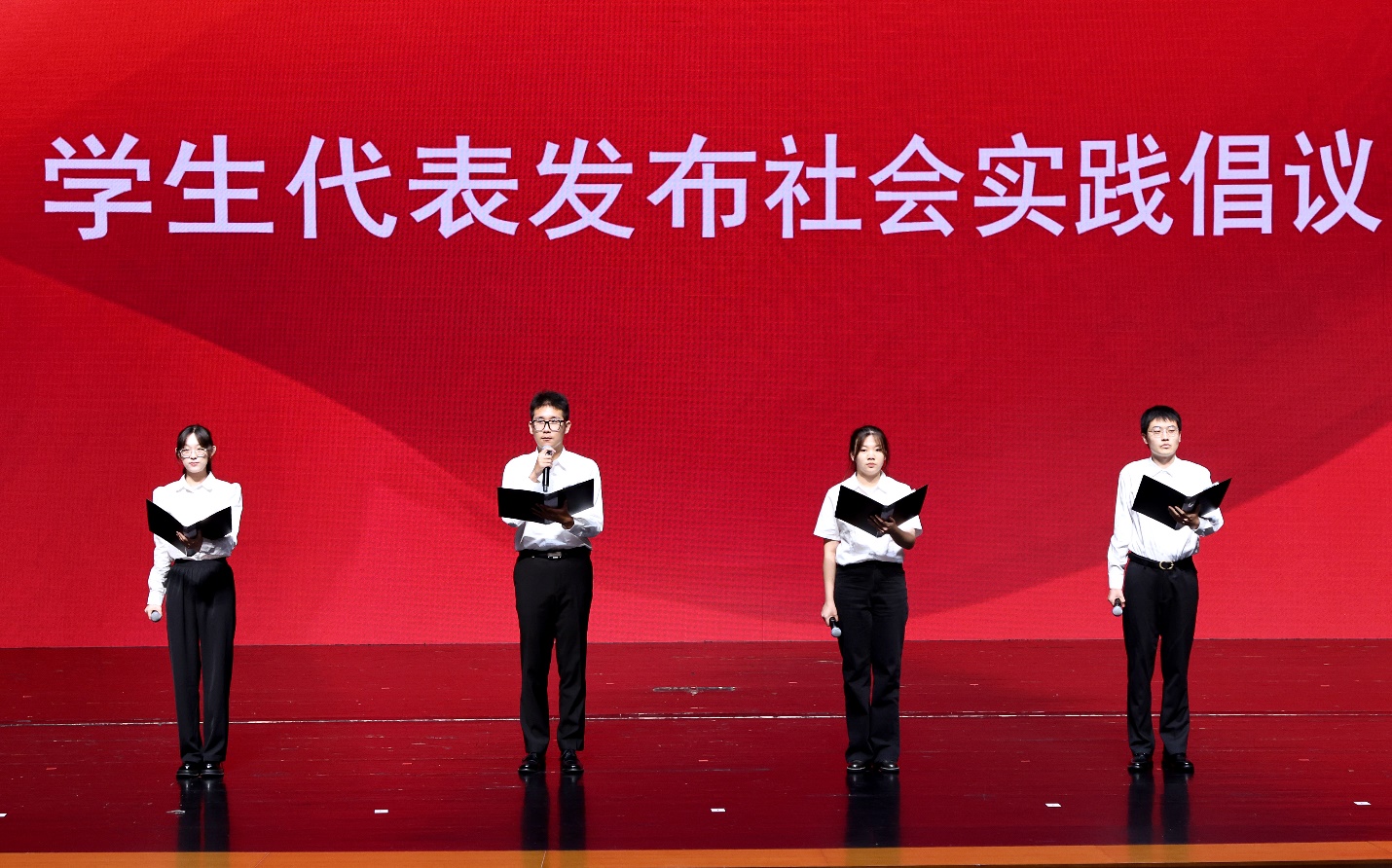 北京高校学生代表向全国大学生发出踊跃投身新时代火热社会实践的青春倡议,全体师生在齐声高唱《我和我的祖国》中授旗出征。