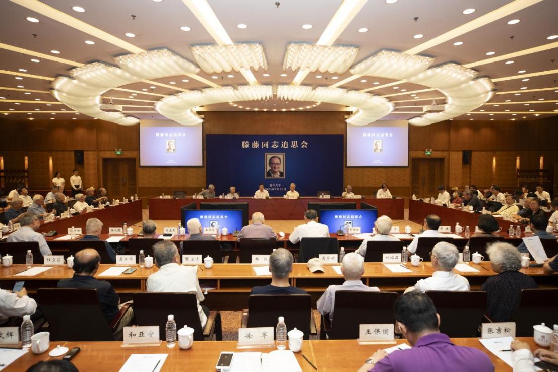 清华大学党委书记邱勇,校党委原书记方惠坚、贺美英,原校长顾秉林,校党委原副书记黄圣伦、胡显章,校务委员会副主任史宗恺、王岩,中国老科学技术工作者协会常务副会长齐让,北京大学欧阳颀院士,清华大学化工系金涌院士、费维扬院士、杨万泰院士,北京语言大学原校长曲德林,教育部国际司原副巡视员纪建军等滕藤同志生前的同学、同事、学生,滕藤同志亲属滕丹、薛捷、滕运,以及化工系、化学系、工物系、核研院、人文学院、社科学院负责人、教师和退休教师代表,学校相关党政部门负责人,校友代表,学生代表等近百人参会。校党委副书记向波涛主持追思会。