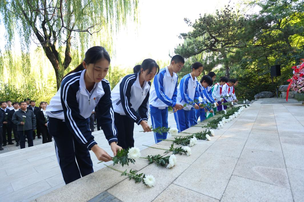 雄壮的国歌唱毕,仪仗队向“祖国儿女·清华英烈”纪念碑敬献花篮。随后,全体师生肃立,向这座纪念碑上镌刻着的65位在抗日战争和解放战争时期献身的清华英烈以及千千万万为国捐躯的英雄儿女表示深切哀悼。