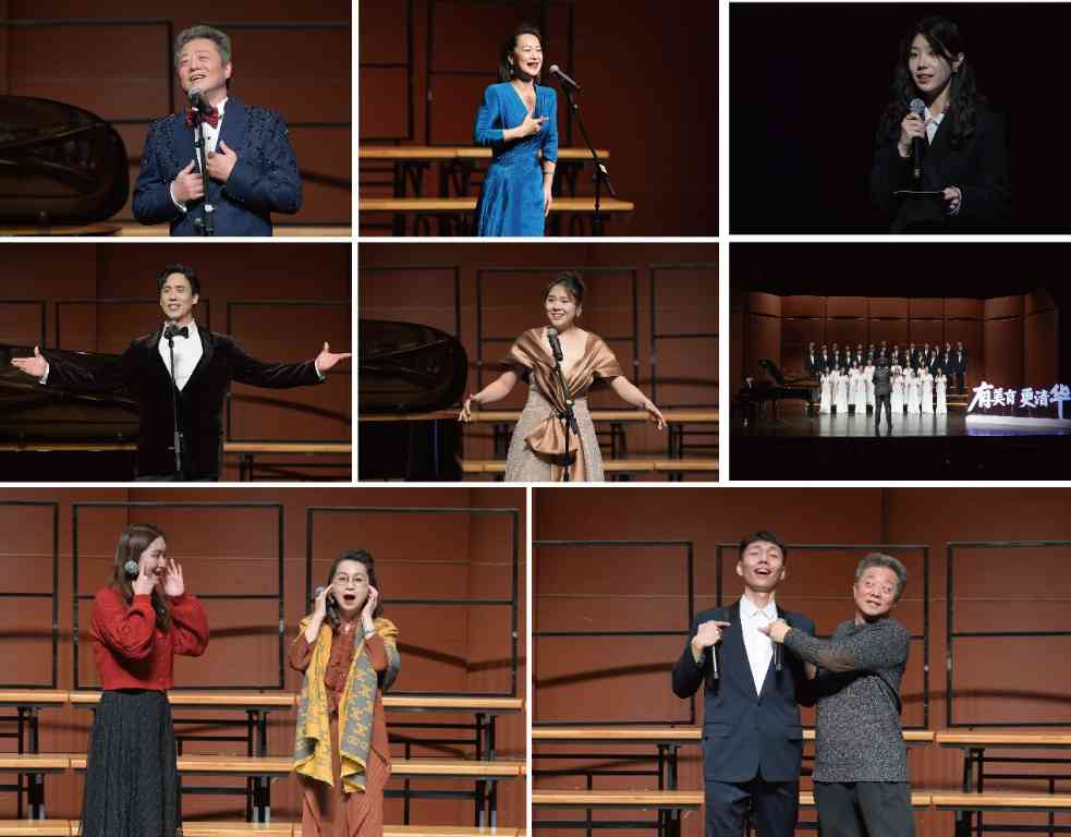 会后,“日出东方”主题音乐会暨“一二·九”艺术讲堂在蒙民伟音乐厅举行。本次活动在各院系如火如荼筹备“一二·九”歌咏比赛期间开展,分为歌曲赏析和声乐大师课两部分。著名男高音歌唱家、国家一级演员肖金声,女高音歌唱家、国家一级演员杨琼,青年歌唱家、抒情花腔女高音郭琛,青年歌唱家、男中音歌剧演员洪之光,清华大学学生艺术团合唱队带来了动人的歌曲演绎。肖金声、杨琼邀请同学上台演唱,并作出点评与示范,带来了一场学生与艺术家之间的互动交流。