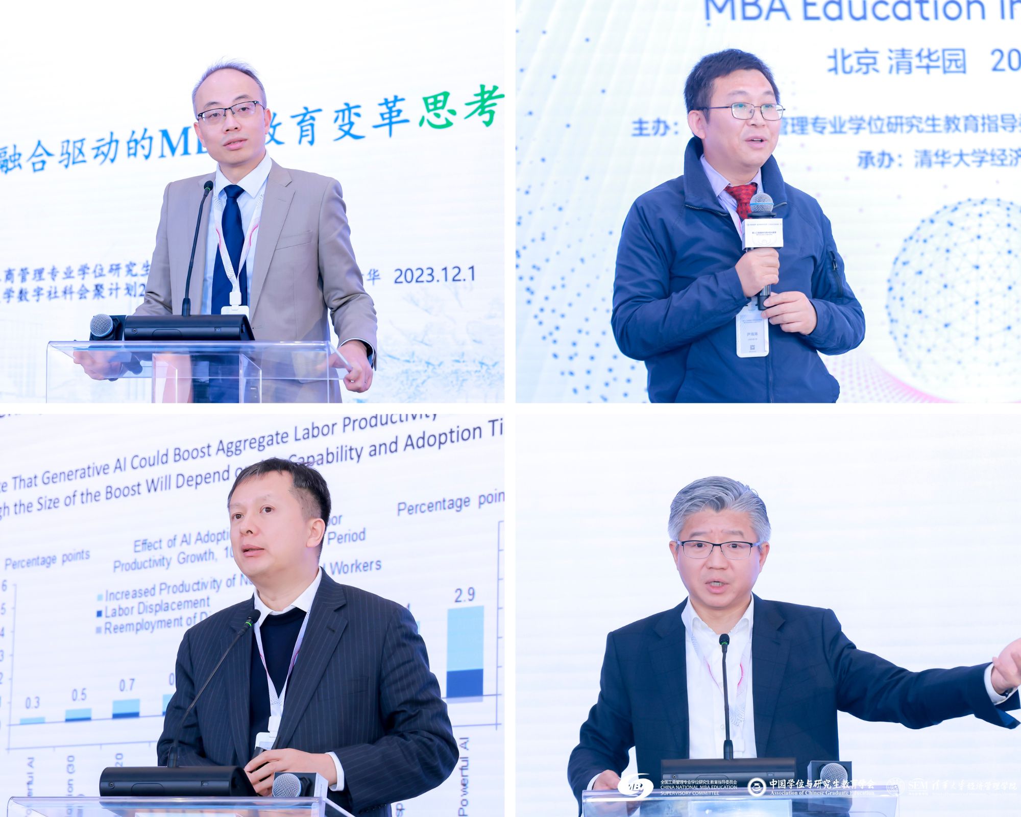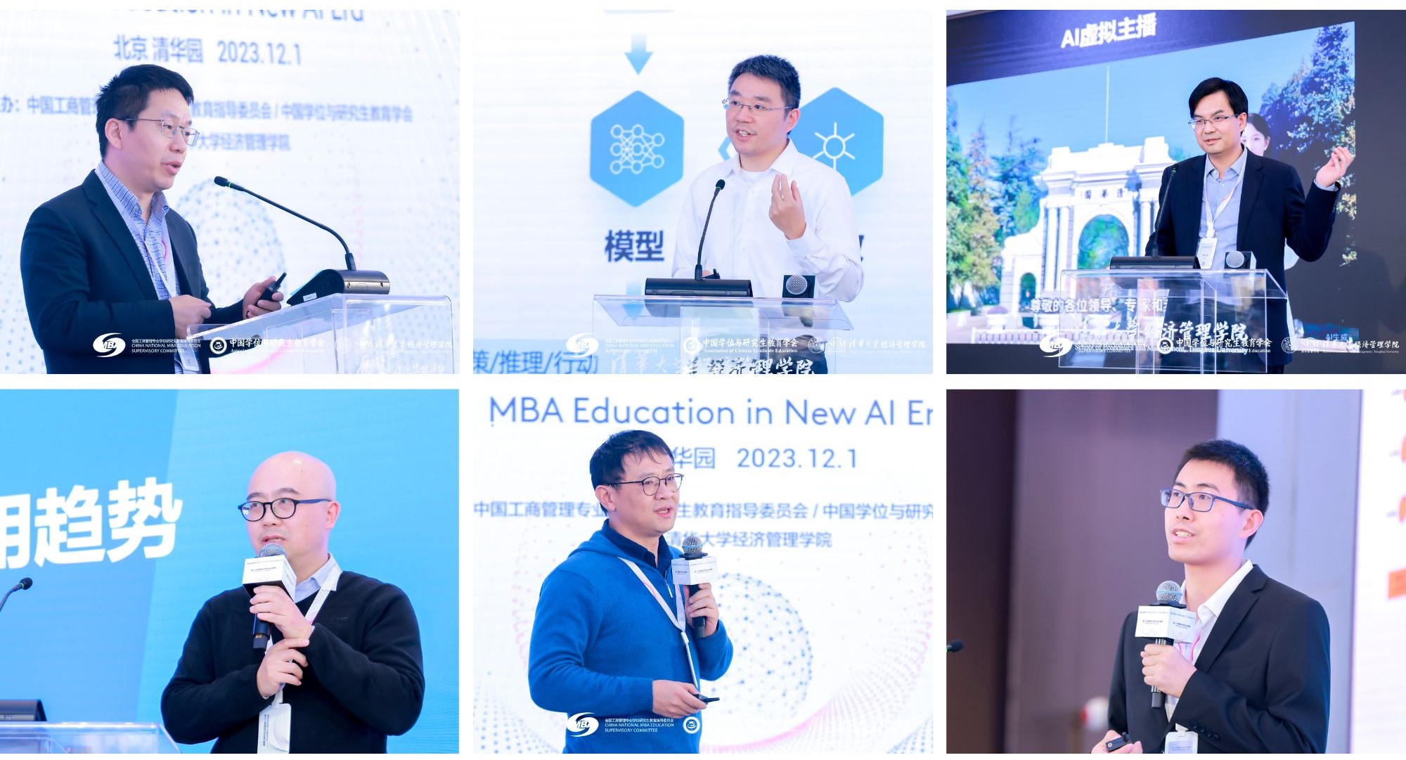 全国MBA教指委委员、浙江大学管理学院常务副院长、党委副书记谢小云,上海交通大学安泰经济与管理学院副院长尹海涛,全国MBA教指委委员、中国科学技术大学讲席教授、科技商学院执行院长、管理学院执行院长、国际金融研究院院长叶强,全国MBA教指委副主任委员、复旦大学管理学院院长陆雄文依次作题为“AI时代数实融合驱动的MBA教育变革”“AI应用给商学教育的挑战”“数智时代的管理教育”“AI时代的管理学院未来”的分享。