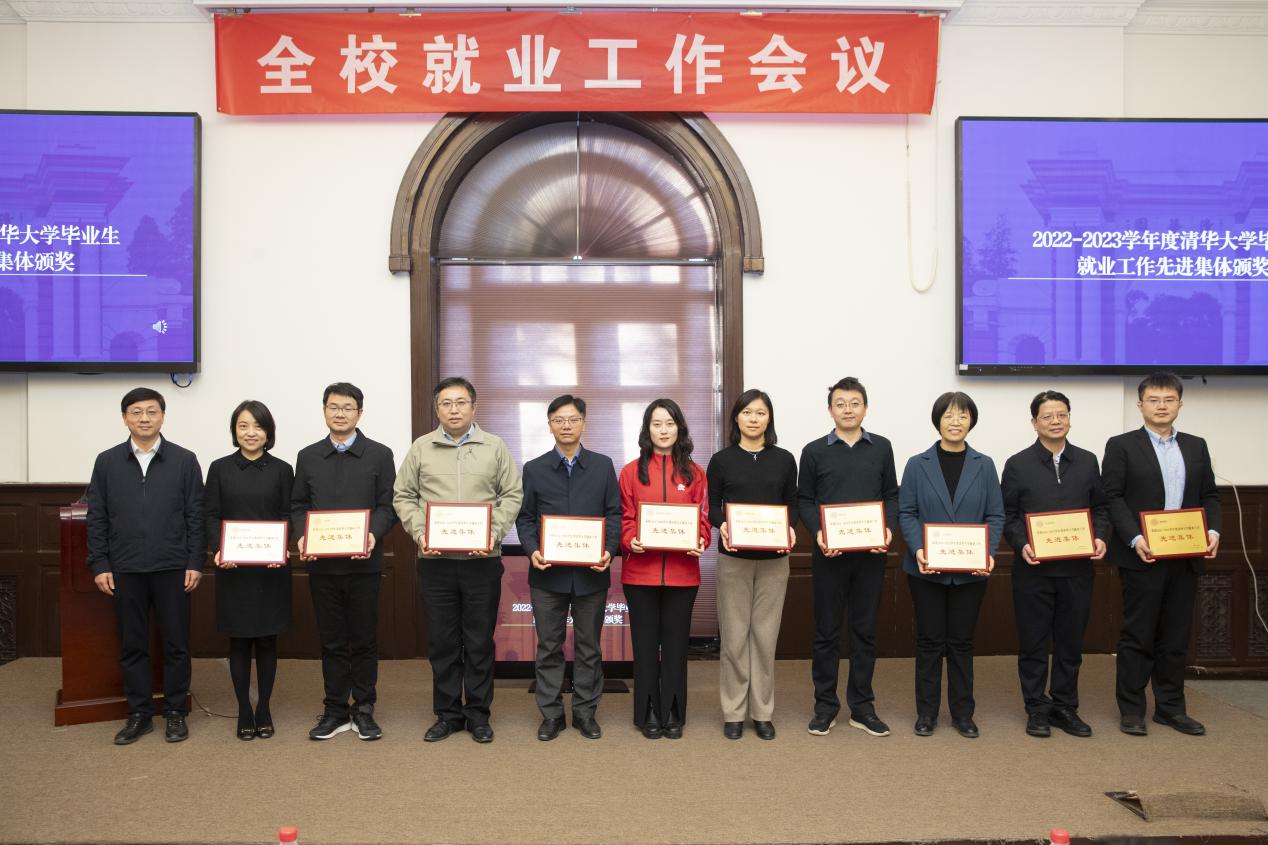 会议对2022-2023学年度清华大学毕业生就业工作先进集体和先进个人进行了表彰,彭刚宣读表彰决定。许庆红,校党委宣传部常务副部长、新闻中心主任刘涛雄,教育基金会秘书长袁桅为获奖院系颁奖。