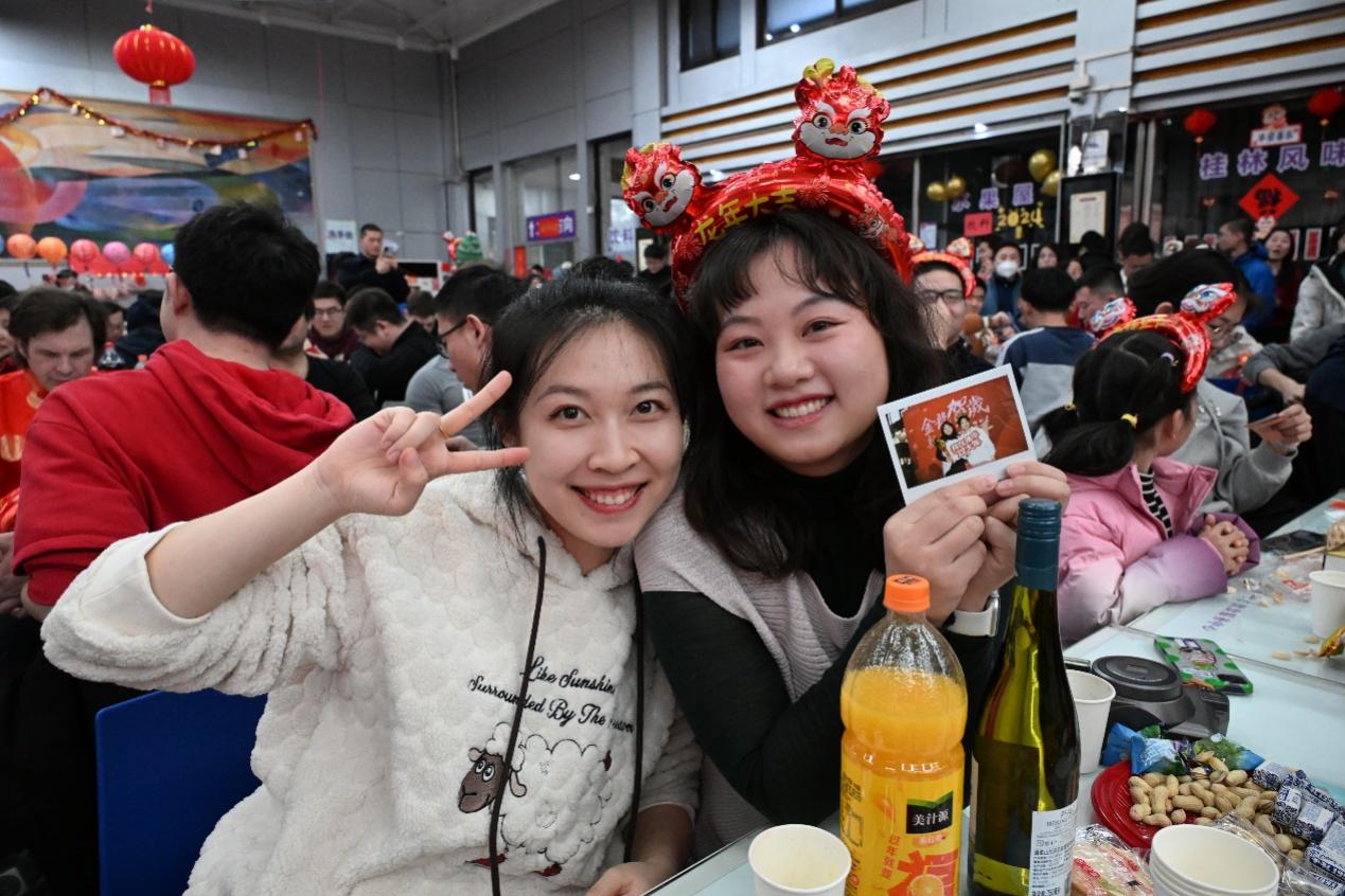 相较于往年的除夕联欢活动,此次特别增设了民俗庙会,并邀请了北京琴书非遗传承团队带来系列表演,书法名家为师生现场书写福字和春联,无论是风俗体验区、食品制作区,还是游戏体验区、温情互动区,每个摊位前都人头攒动。参加活动的师生吃着酸甜可口的糖葫芦,品着醇香的盖碗茶,咬着甜蜜的棉花糖,提笔在现场描摹春联和福字,还可以剪窗花、做花灯、做花馍、包饺子、包汤圆,进行猜灯谜、套圈、冰壶、篮球机等小游戏,更可以拍照打卡,将明信片寄给远方的家人报平安。