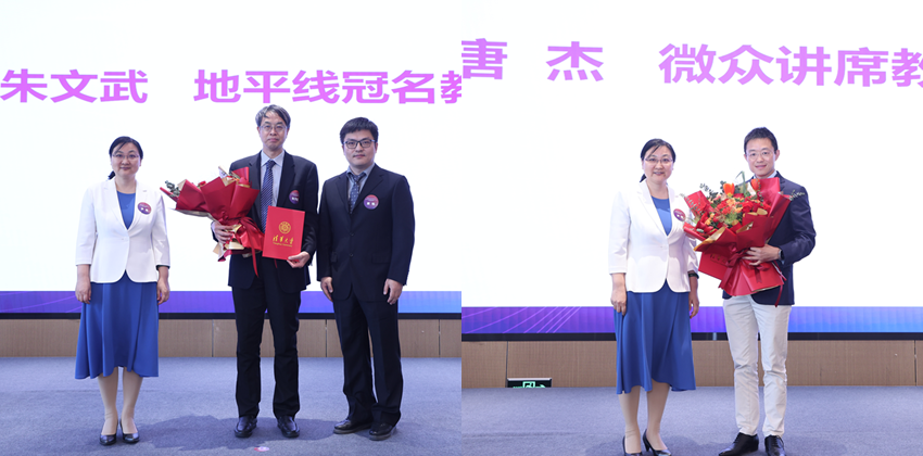 “清华大学计算机系讲席(冠名)教授”捐赠仪式和聘任仪式环节由计算机系副系主任徐恪主持。贾珈与清华大学教育基金会副秘书长段江飞共同为到场的捐赠方——青岛泰屹投资发展有限公司、北京地平线信息技术有限公司、北京费马科技有限公司、九坤投资(北京)有限公司的代表颁发捐赠牌。尹霞与各捐赠方代表共同为本次聘任的地平线冠名教授朱文武、微众讲席教授唐杰、费马科技讲席教授武永卫、九坤冠名教授赵有健、王建筑讲席教授陈文光颁发了讲席(冠名)教授聘书。