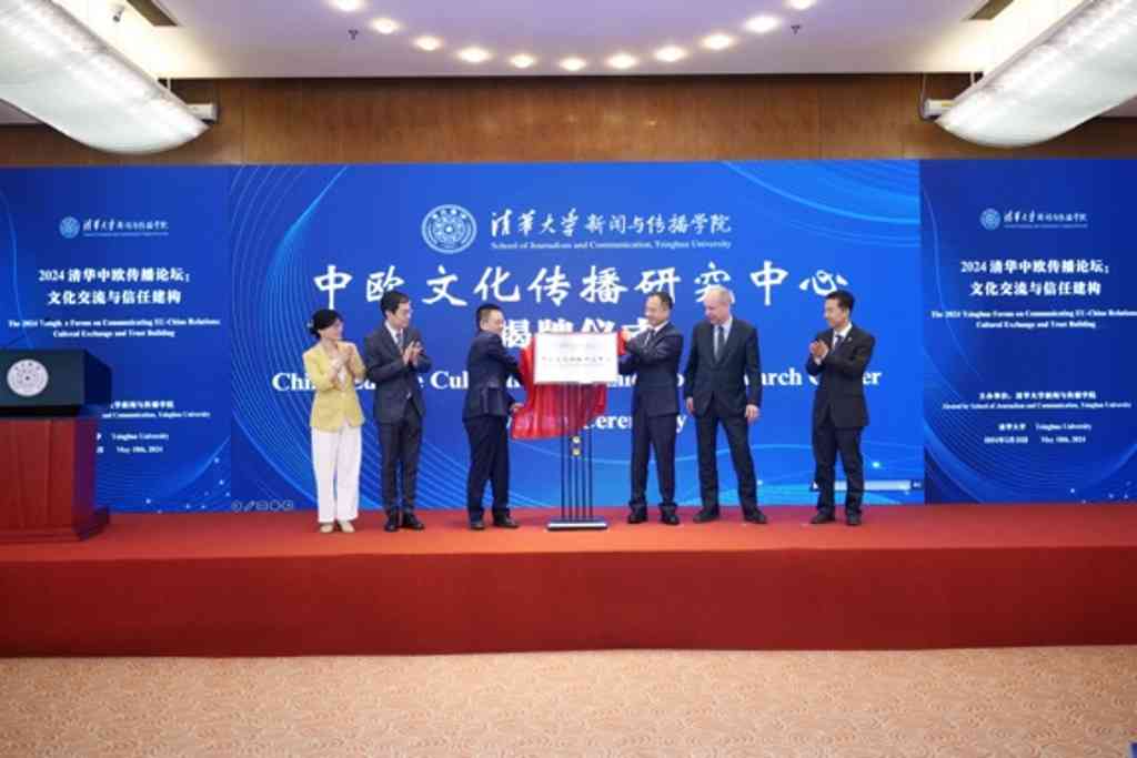 清华大学副校长彭刚(左三),人民日报社副总编辑崔士鑫(右三),清华大学新闻与传播学院党委书记胡钰(右一),清华大学新闻与传播学院院长周庆安(左二),清华大学新闻与传播学院副院长、中欧文化传播研究中心主任张莉(左一),欧盟驻华使团副大使雷默思(右二)为中欧文化传播研究中心揭牌