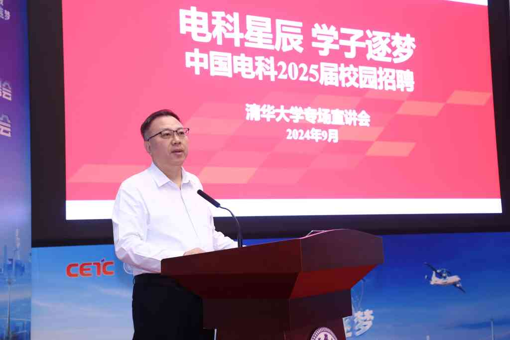 在中国电子科技集团有限公司2025届专场招聘会上,史宗恺代表学校对李守武一行表示欢迎。他表示,今年是中国第一颗原子弹爆炸成功60周年、“两弹一星”精神提出25周年,“两弹一星功勋奖章”获得者、清华校友邓稼先和朱光亚诞辰100周年。长期以来,有一大批像邓稼先、朱光亚学长一样的清华人在国防科工领域扎根奉献,为国家自立自强奋斗一生。希望清华学子能够在前辈的感召下,坚定报国志向,投身国防科工,到党和国家最需要的地方发光发热、贡献力量。