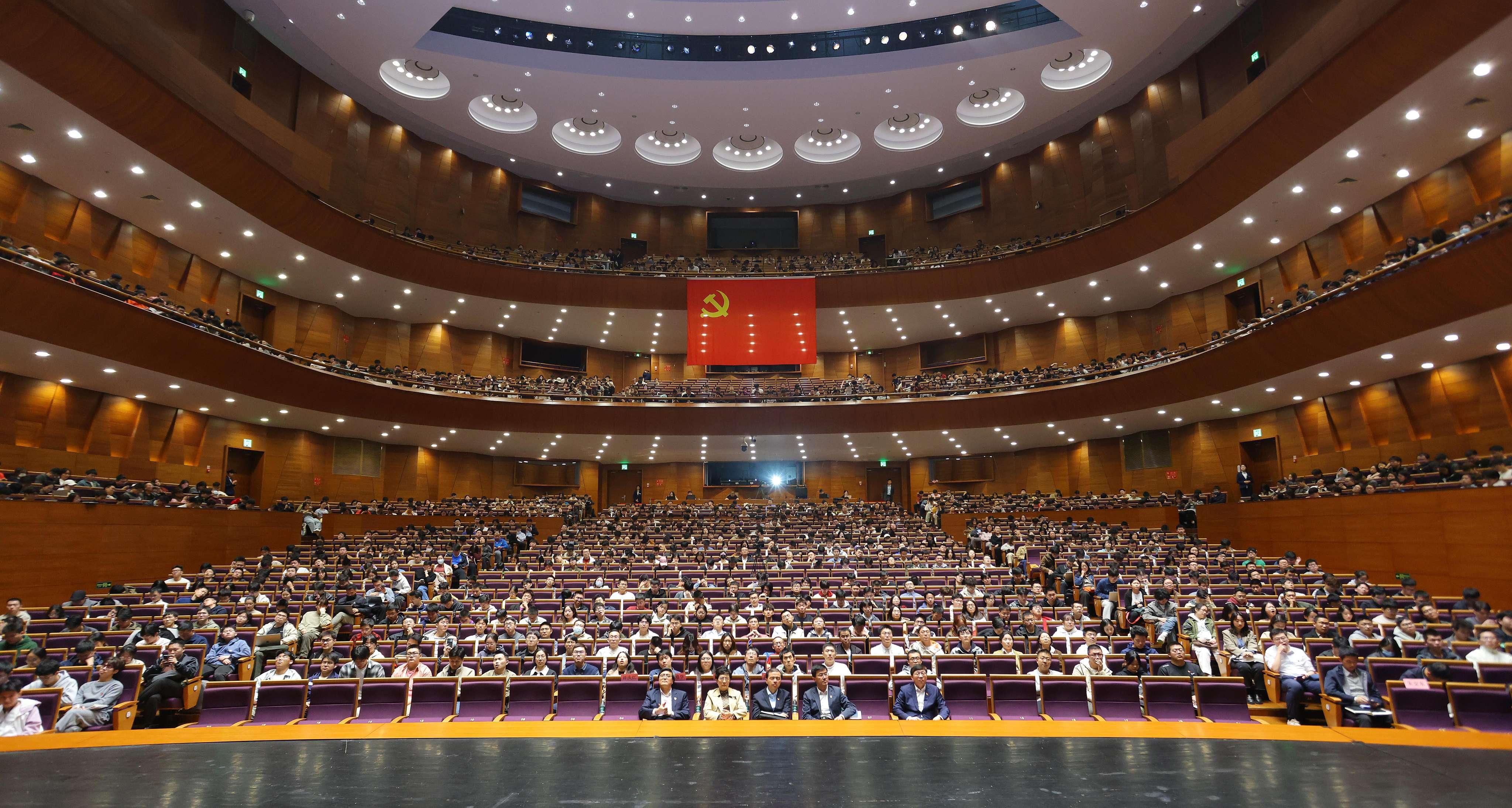 校领导向波涛、过勇、姜培学、许庆红,全校1.4万余名学生党员在新清华学堂主会场和130余个分会场及荷塘雨课堂参加培训。过勇、马克思主义学院教授朱安东作专题报告,许庆红主持。