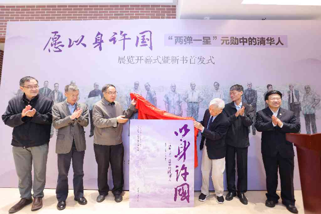 史宗恺,葛能全,清华大学校史编委会委员、出版社党委书记、董事长邱显清,科学技术史暨古文献研究所教授、本书主编冯立昇,校史编委会副主任、校史研究室原主任、档案馆原馆长、本书主编范宝龙,物理系原党委书记、粒子物理核物理与天体所所长王青共同为《愿以身许国——“两弹一星”元勋中的清华人》新书首发揭幕。