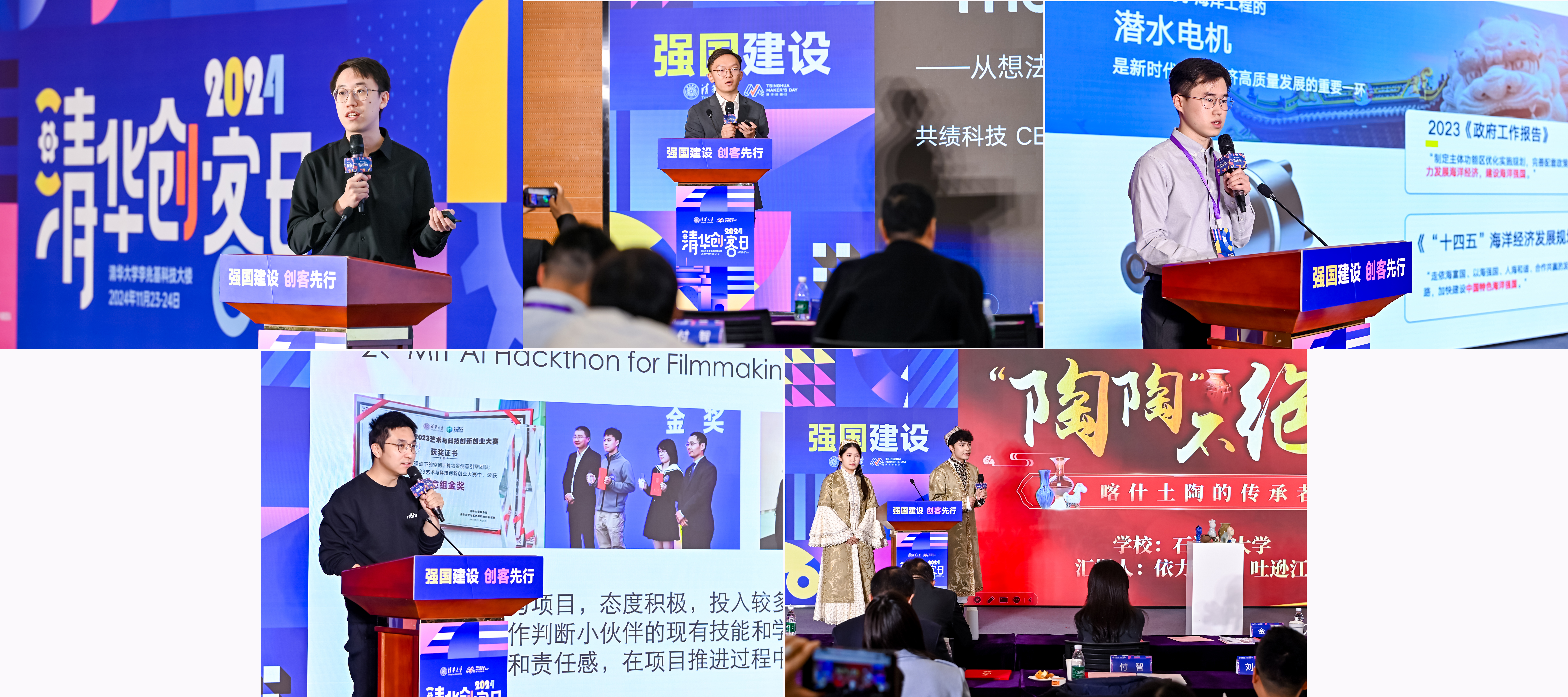 中国国际大学生创新大赛的优秀代表王智权、付智,中美青年创客大赛的优秀代表唐贤,iStar计划优秀代表陶柏帆展示了清华创客之路。来自新疆生产建设兵团的西部学生代表孙佳睿和依力扎提·吐逊江分享了传承与创新项目。