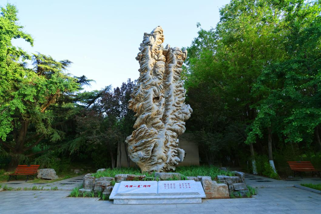 刻石后方的灵璧石由清华大学安徽校友会于2011年母校百年华诞时捐赠,高12米,重约110吨,外观如同一朵正在升起的“蘑菇云”,清华老校友吴邦国同志为其题名“擎天柱”。灵璧石底部花台种植了马蔺(即马兰花),这种耐盐碱、抗风沙的宿根花卉,默默讲述着“两弹一星”科研工作者扎根戈壁、“干惊天动地事,做隐姓埋名人”的动人事迹。“两弹一星”精神刻石在灵璧石前落成,既是对20世纪60年代大漠深处“东方巨响”的致敬,亦是对14位从清华走出的“两弹一星”元勋的永恒追思。