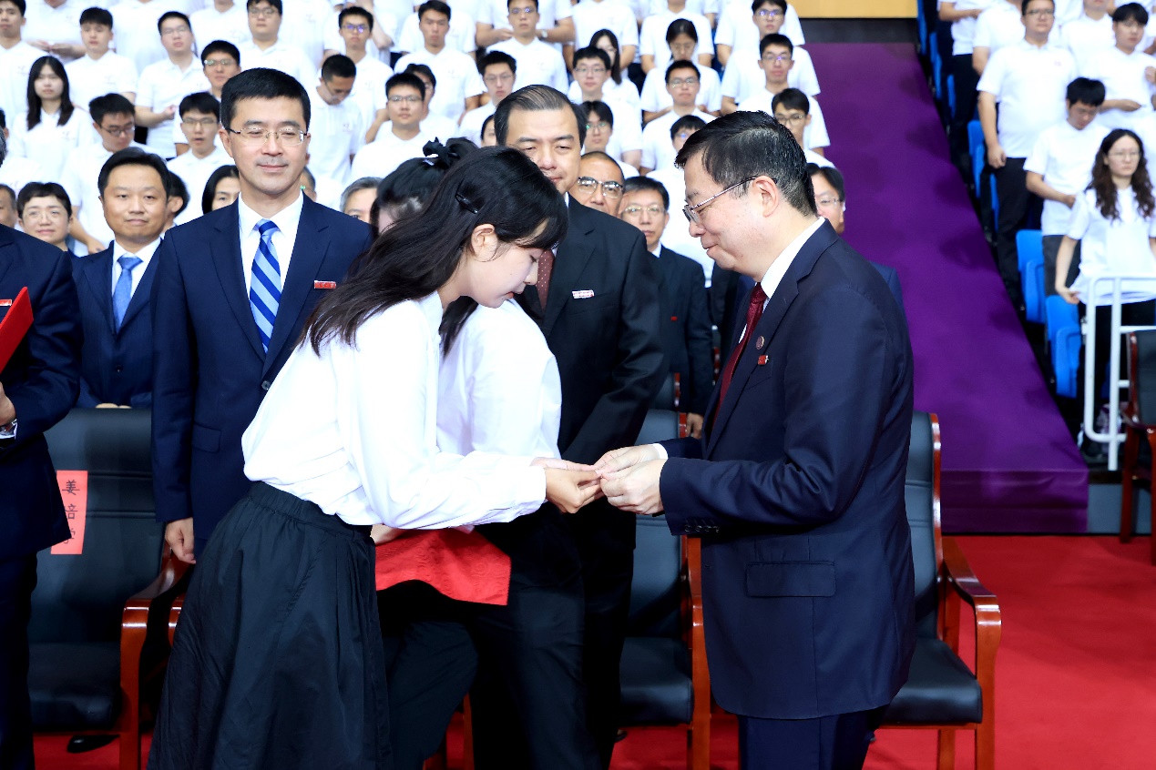 典礼上举行了新生佩戴清华大学徽章仪式,校党委书记邱勇为新生代表送上清华大学徽章。这枚徽章,不仅代表着“清华人”的身份,更承载着清华“自强不息、厚德载物”的精神,承载着清华人的使命与荣光。