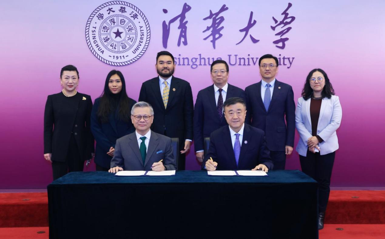 在邱勇和东姑阿米尔沙王储的共同见证下,杨斌和联合国教科文组织创业教育联盟东南亚分会亚洲可持续发展、创业与外交研究院(AiSED)主席、拿督谢锦成分别代表双方签署“清华大学与亚洲可持续发展、创业与外交研究院(AiSED)谅解备忘录”。