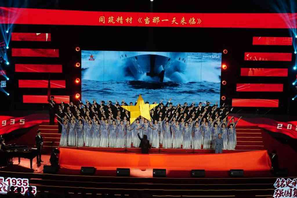 在各联队演出结束后,朱芃菲以一曲《我和我的祖国》将全场氛围推向高潮,用歌声传递对祖国深沉而真挚的祝福。