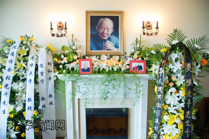 图为张光斗先生遗像,两边摆放的是水利部与清华大学敬献的花篮和挽联。学生记者 王皓冉 摄