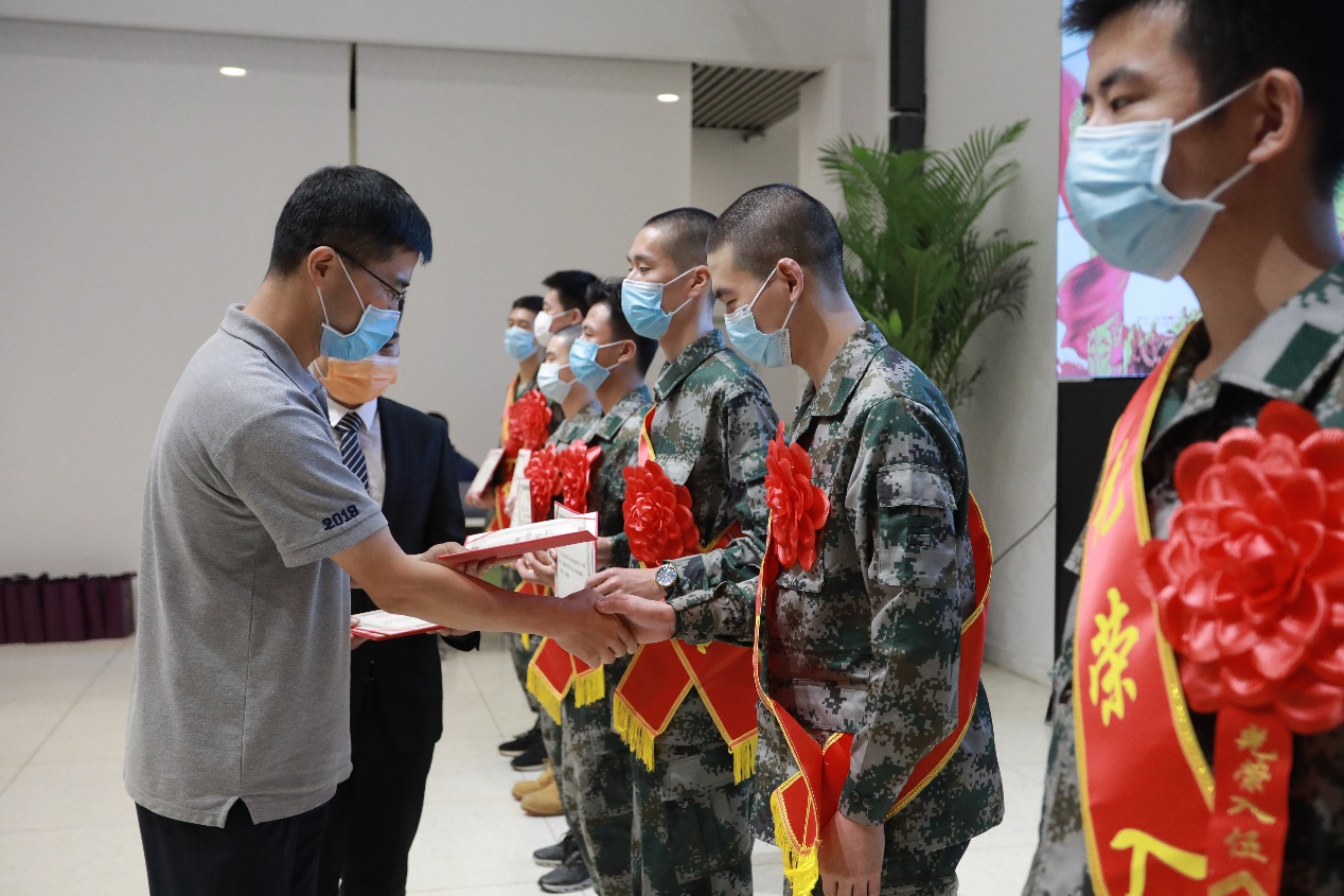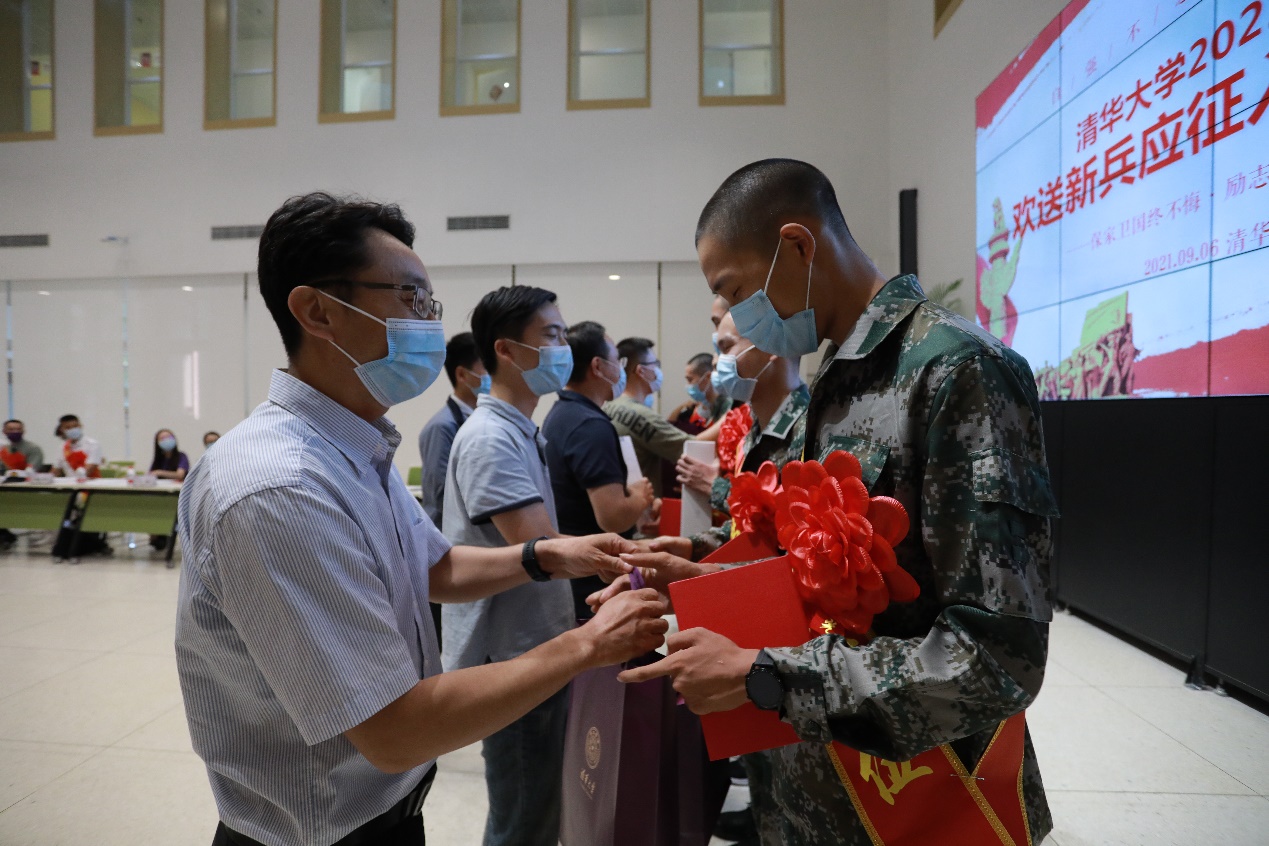 过勇为入伍同学颁发了清华大学学生应征入伍专项奖励金荣誉证书,各院系代表也向同学们赠送了纪念品,并送上最美好的祝福。