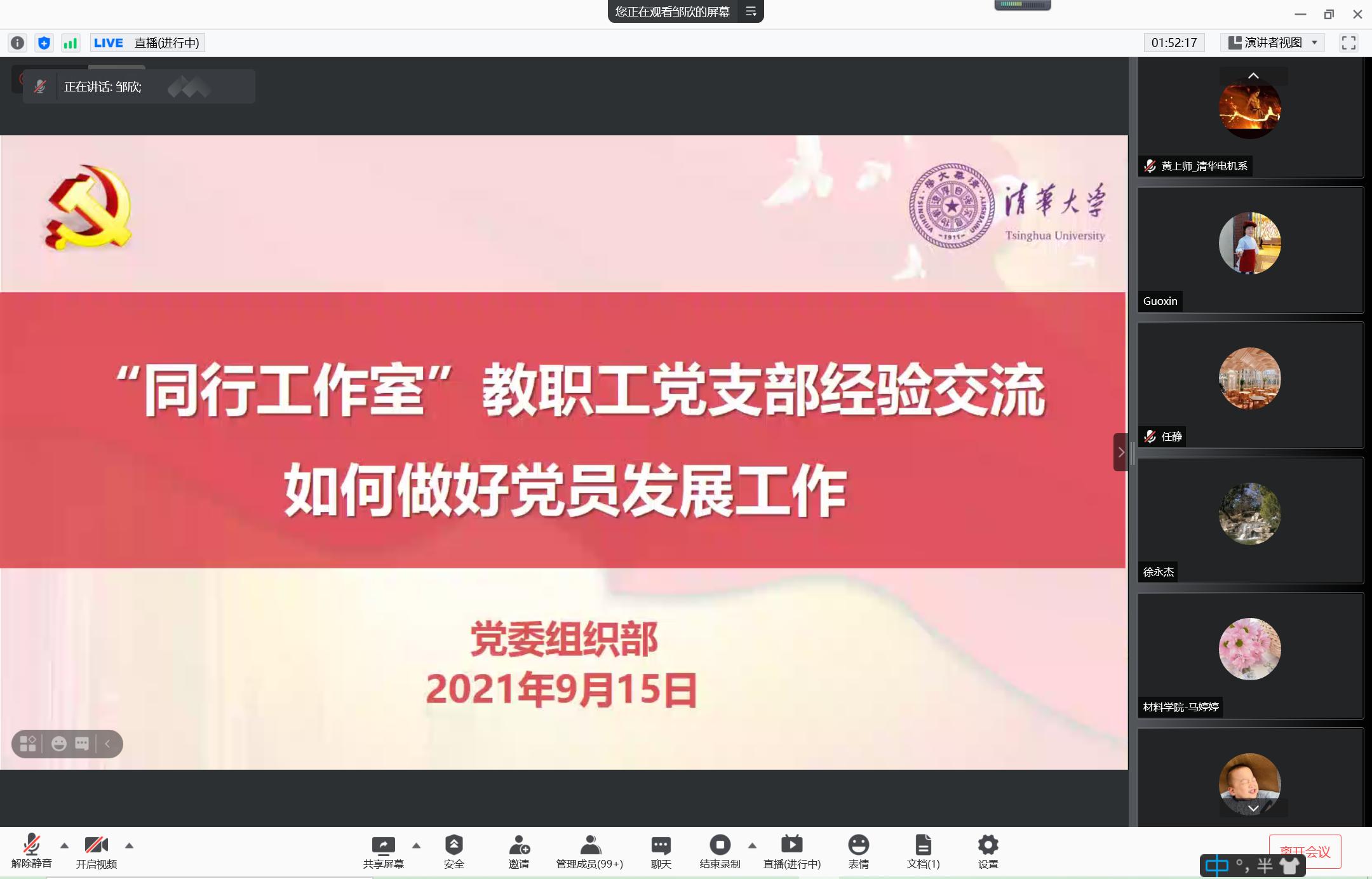 清华新闻网9月18日电 9月15日下午,党委组织部在线举办“同行工作室”教职工党支部工作经验交流会,围绕“如何做好党员发展工作”分享好经验好做法。全校600余名教职工党支部书记、委员在线参会。