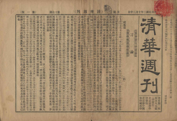 《清华周刊》创刊于1914年3月24日,是一份由清华学生主办的刊物,原名《清华周报》,1914年9月22日改名为《清华周刊》,1920年以前由学校指派学生编辑,“五四”运动以后,由学生会主编,改办大学后,《周刊》成为清华大学学生自治会的刊物,由学生会干事会的出版科委员负责组织编辑出版,1947年9月25日被列入禁刊,停止发行。该刊承载了清华23年的历史(1937年1月-1947年1月停刊),是清华大学校史历史的缩影,也是中国近现代史上重要的学生刊物之一。