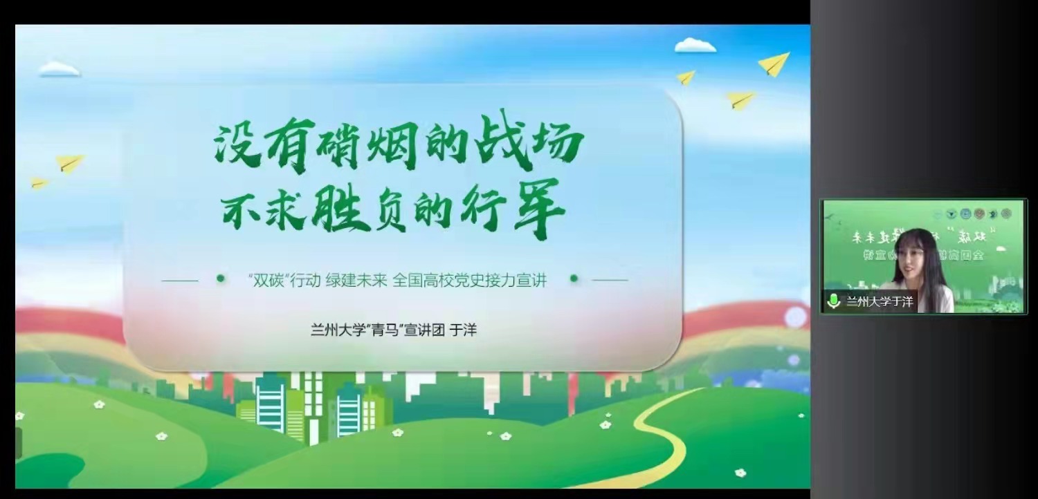 兰州大学“青马”工程大学生骨干理论宣讲团讲师于洋以“没有硝烟的战场不求胜负的行军”为题,分析了中国的“双碳”目标,解读了我国在生态文明建设领域取得的举世瞩目的成就。她表示,对环境的保护贯穿历史与未来,同社会发展的各方面息息相关。应当紧紧抓住“双碳”的终极目标,稳稳掌控“两山”的战略地位,着力建设“人类命运共同体”“人与自然生命共同体”。