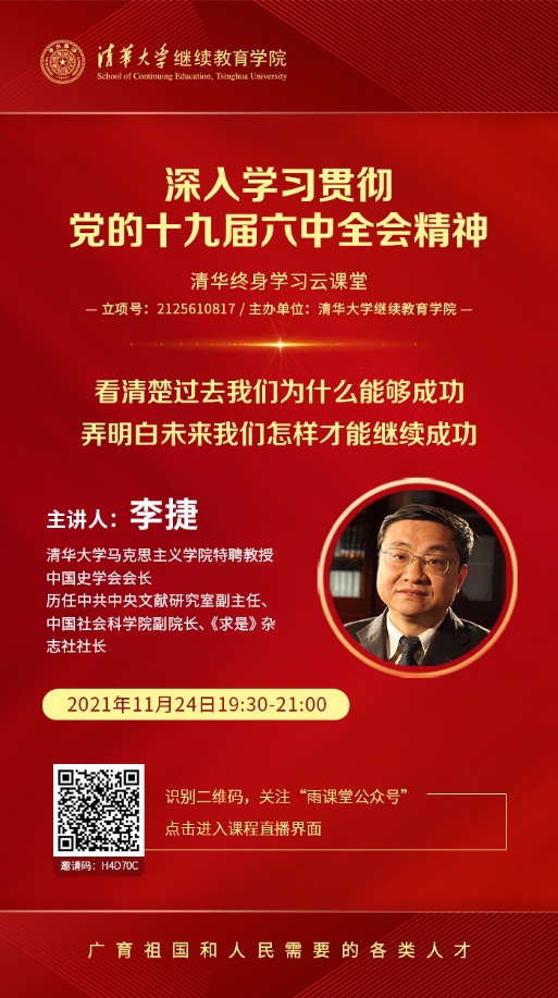 11月24日晚,清华大学继续教育学院特别邀请到清华大学马克思主义学院特聘教授、中国史学会会长李捷老师,以《用党的初心使命诠释过去能够成功、未来继续成功的光辉文献——深入学习贯彻党的十九届六中全会决议的学习体会》为题,通过“雨课堂”平台在线直播,辅导广大学员和教职员工深入学习六中全会决议。