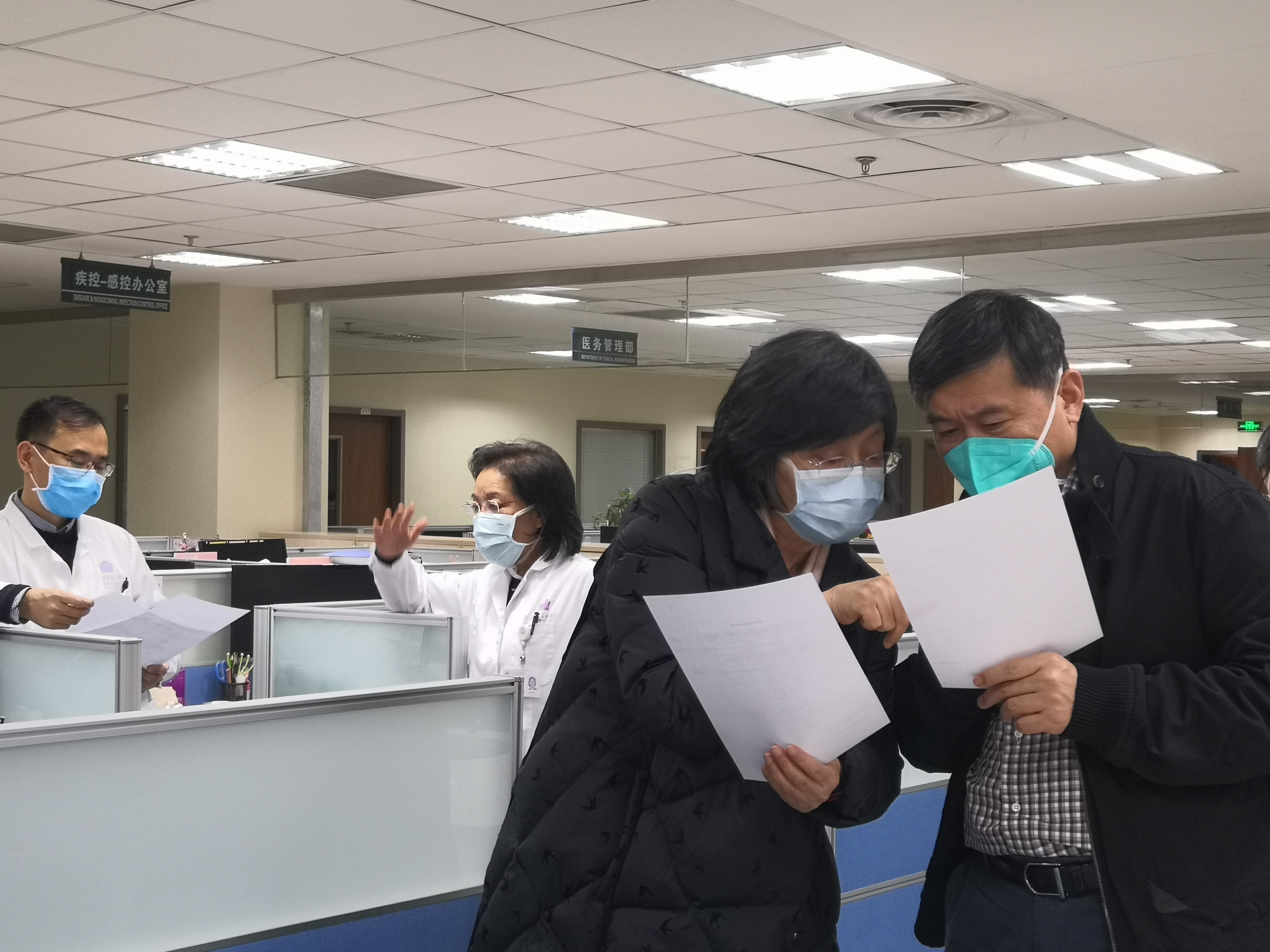 董家鸿(右一)与医院临床专家研讨新冠个人自测评估系统场景