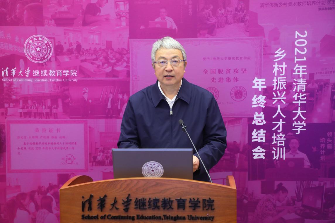 王光谦指出,清华大学始终与国家的发展和民族的复兴同呼吸共命运,坚持扎根中国大地建设世界一流大学。学校坚持把服务国家作为最高追求,积极参与脱贫攻坚和乡村振兴,尽己所能贡献清华力量。他介绍,继续教育学院是学校服务脱贫攻坚和乡村振兴的一支重要队伍,长期坚持开展教育帮扶,服务乡村人才发展。2021年底,学院已在456个县区建立乡村振兴远程教学站点,累计培训1000万人次,取得显著社会效益。在2021年2月举行的全国脱贫攻坚表彰大会上,继续教育学院和对口支援办公室双双荣获“全国脱贫攻坚先进集体”。他表示,全面实施乡村振兴战略的深度、广度、难度都不亚于脱贫攻坚,要深入学习贯彻习近平总书记关于乡村振兴的重要论述,提高站位、狠抓落实,深入推进教育帮扶工作,为国家乡村振兴和现代化建设作出更大贡献。