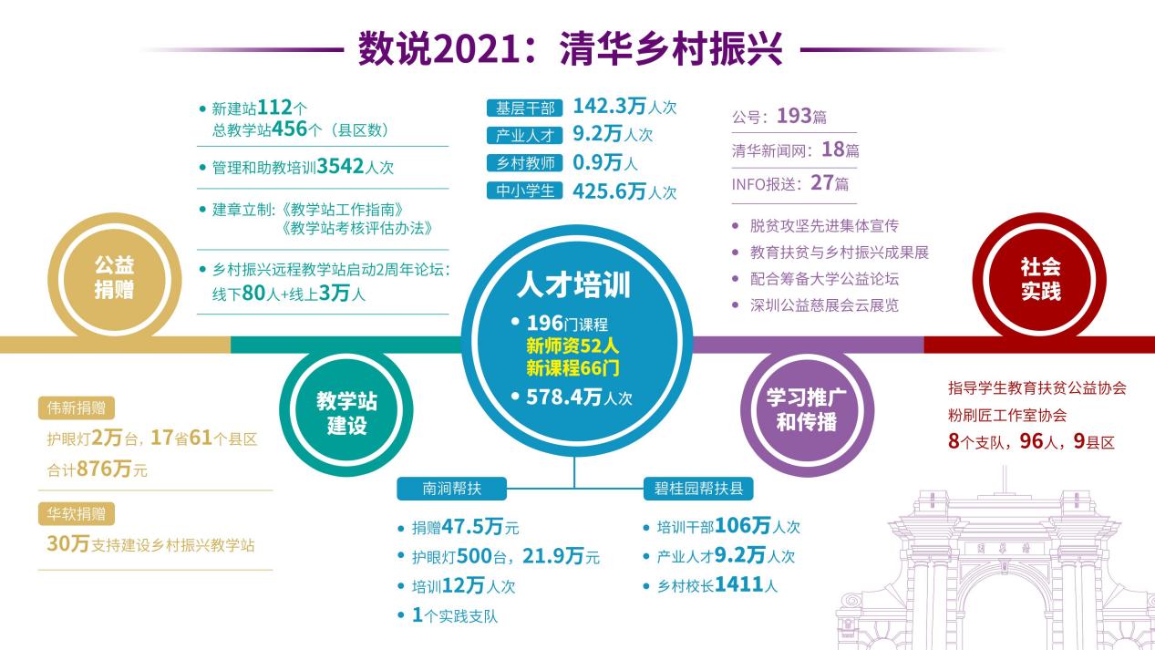 2021年中国共产党成立100周年,也是国家全面推进乡村振兴开局之年。清华大学继续教育学院以习近平总书记关于乡村振兴重要论述为指引,以国家战略需求为导向,以乡村人才发展为目标,有效发挥学校的资源优势和专业能力,积极总结疫情常态化防控以来的探索和实践、加强学习方式创新,提升学习内容品质,以远程教学站为学习平台,全面推进乡村振兴人才培养,全年新建教学站112个,覆盖456个县区。全年培训各类人才共计578万人次。为17省61个县区乡村教师捐赠护眼灯2万台,捐赠总额876万元。成功举办乡村振兴两周年主题论坛,持续拓展乡村振兴公益影响力。