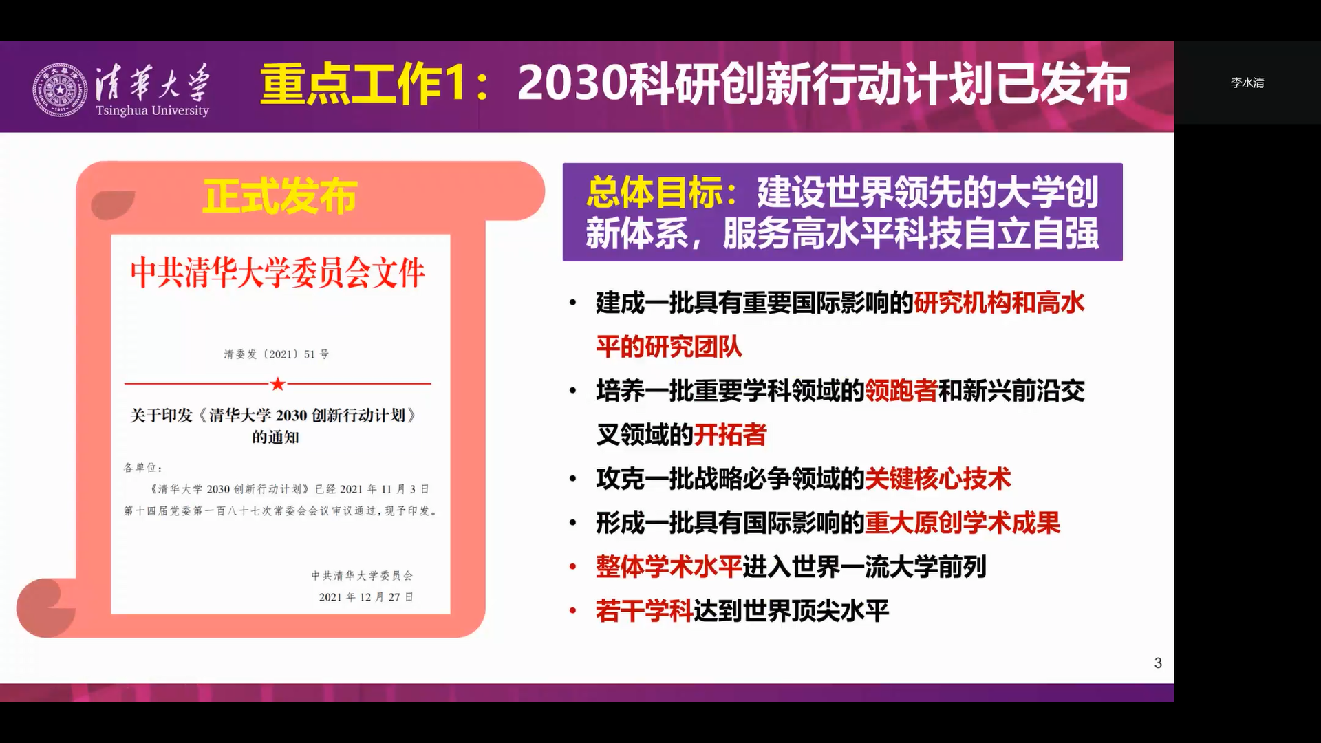 科研院副院长李水清向校学术委员会汇报了2021年清华的科研工作,并介绍了2030科研创新行动计划、“十四五”文科高质量发展行动计划、重大科研活动等具体情况。