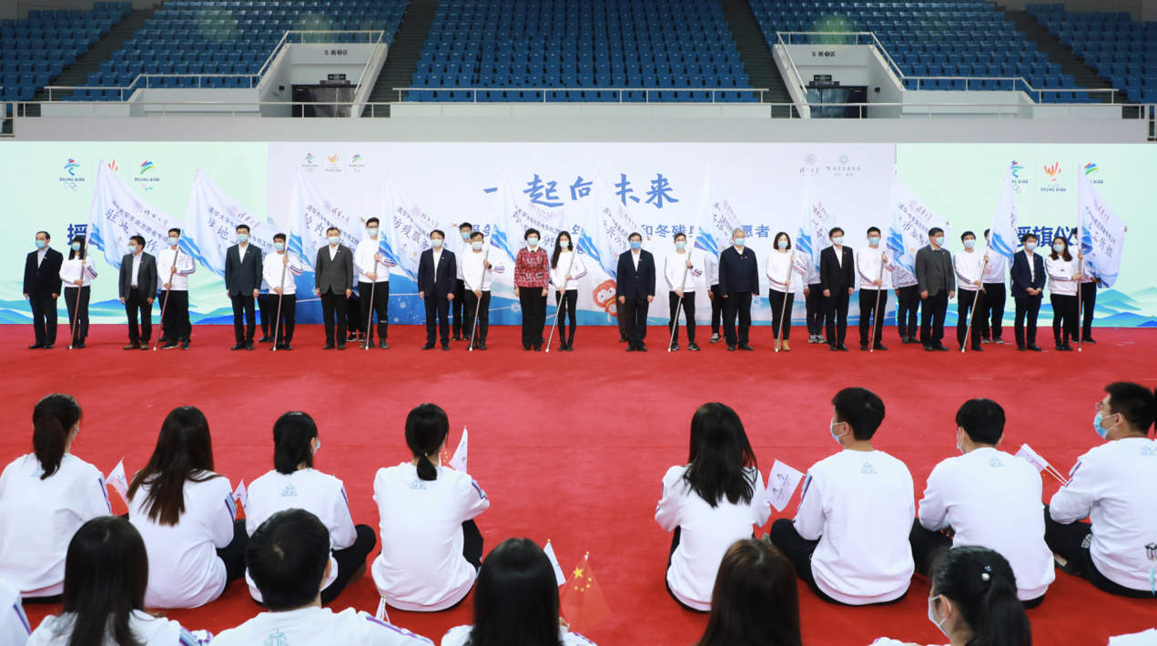 最后,校领导为各分队学生代表授旗,随着《燃烧的雪花》歌曲响起,现场旗帜飘扬,全场志愿者同学也挥动着手中的旗帜并报以热烈的掌声。“请祖国放心,请总书记放心!”“‘清’春迎冬奥,一起向未来!”响彻综合体育馆的口号声抒发着师生志愿者们出征前的壮志豪情。清华志愿者们必将以青春担当谱写无悔志愿年华,于冬奥赛场绽放绚丽志愿之花。