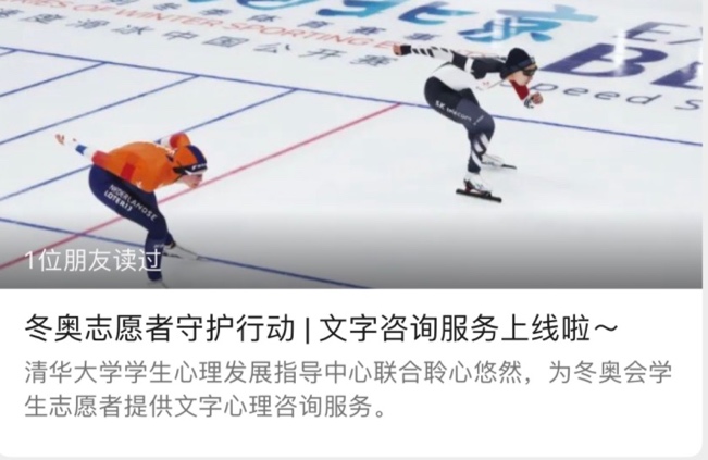 截至目前,清华学生专属心理服务热线共有37位专兼职心理咨询师开展24小时全天候服务;文字咨询服务已提供了276个时段,各类心理讲座培训工作覆盖1500人次;406名冬奥志愿者参加了15天线上正念冥想课;录制的七个冬奥志愿者心理加油站短视频系列即将发布。未来,清华大学学生心理发展指导中心将继续为冬奥志愿者心理健康保驾护航。