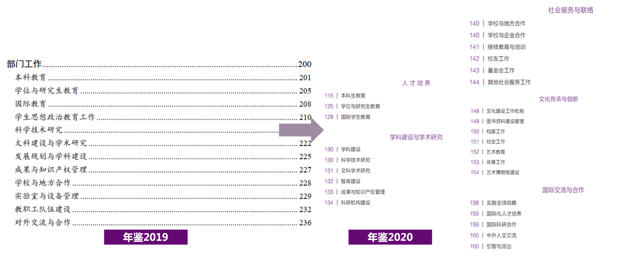 “在调研、对比、分析之后,出于对信息公开工作和对学校工作的整体把握,我们改变了以往按部门工作划分的基本框架,选择以高校五大任务职能作为基本逻辑,来全面展现学校年度主要工作。”党办校办信息室徐思羽打开了话匣子,“大家看到的这本《清华大学年鉴》,既是一部清华历史的积淀,更是一个创新突破的产物。”