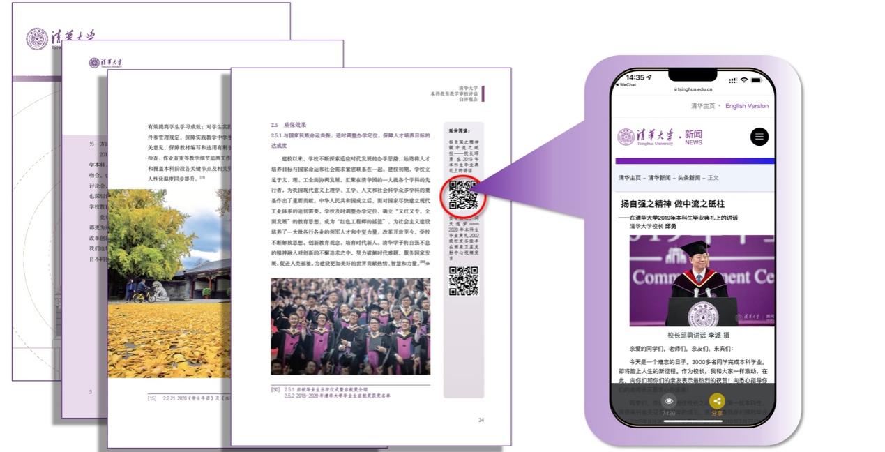 翻开2021清华大学本科教育教学评估自评报告,制作精致美观、文风典雅隽永,仔细观察还会发现许多页面旁嵌着一枚枚二维码。