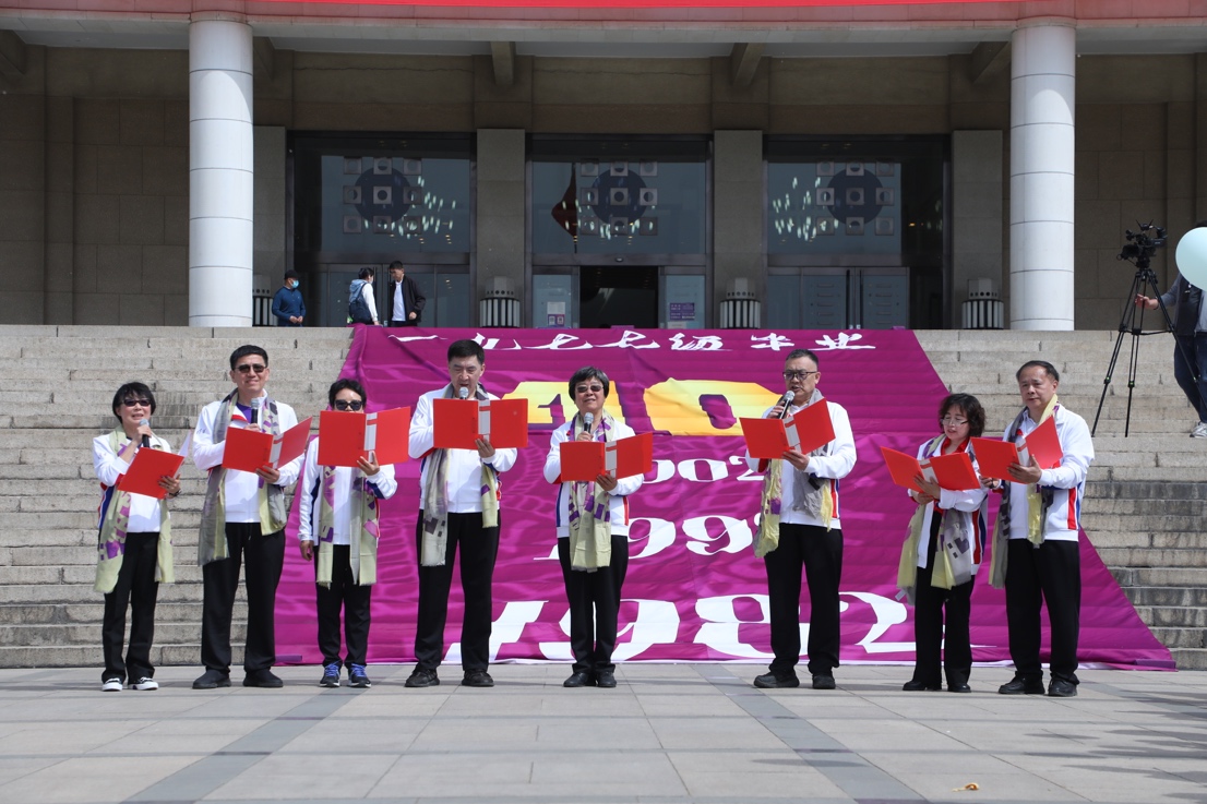 在《红旗颂》的伴奏下,校友代表韩景阳朗诵散文,八名校友代表集体朗诵毕业二十周年发布的《1977级世纪宣言》。主楼前,校友们胸前戴着的炽烈火红的吊牌,书写着年级和姓名;他们手上牵系着的气球徜徉在空中,五彩斑斓胜过彩虹。他们说着笑着、回忆着展望着,早上九点的阳光洒在他们的笑脸上,一如四十年前。