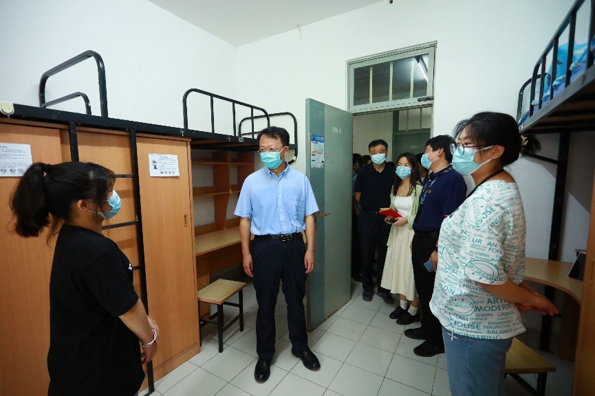 随后,王希勤一行来到紫荆学生公寓4号楼,详细查看了新生宿舍的设施配备、水电供应、消防安全及防疫准备措施等情况,从通风通光、用水用电、环境卫生,到桌椅高度、床铺梯子设计和安全性等,对每个设施进行逐一检查,并向新生详细了解各项设备设施的使用体验。