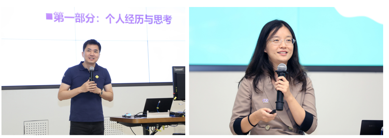 李蕉(左)介绍课程思政的理念与实践,班慧勇带来教学示范课