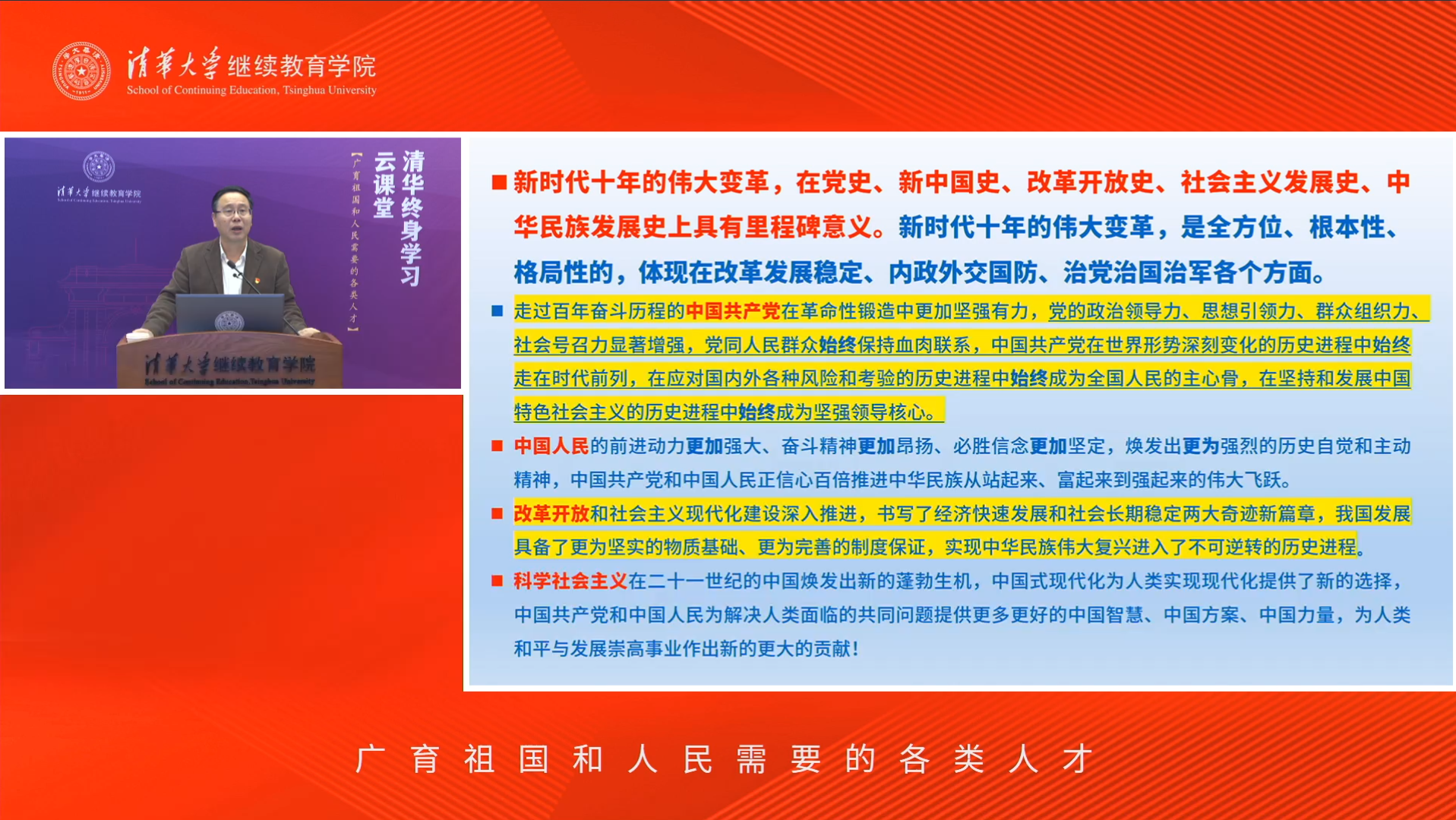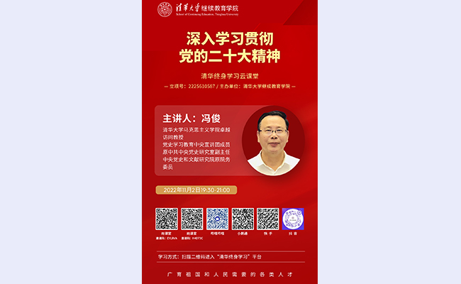 清华新闻网11月3日电 11月2日晚,继续教育学院“清华终身学习云课堂”开讲。清华大学马克思主义学院卓越访问教授、中共中央党史和文献研究院原院务委员、原中共中央党史研究室副主任冯俊应邀授课,辅导广大学员和学院全体教职员工深入学习贯彻党的二十大精神。近十万人次通过多个平台共学课程。