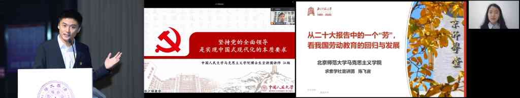 在随后进行的首场示范宣讲中,清华大学马克思主义学院2021级博士研究生车宗凯、中国人民大学马克思主义学院2019级博士研究生江烜、北京师范大学马克思主义学院2021级本科生陈飞音分别围绕“中国式现代化:我们的光荣与梦想”“坚持党的全面领导是实现中国式现代化的本质要求”“从二十大报告中的一个‘劳’,看我国劳动教育的回归与发展”三个主题进行示范宣讲,从青年角度出发分享学习党的二十大精神的心得体会。