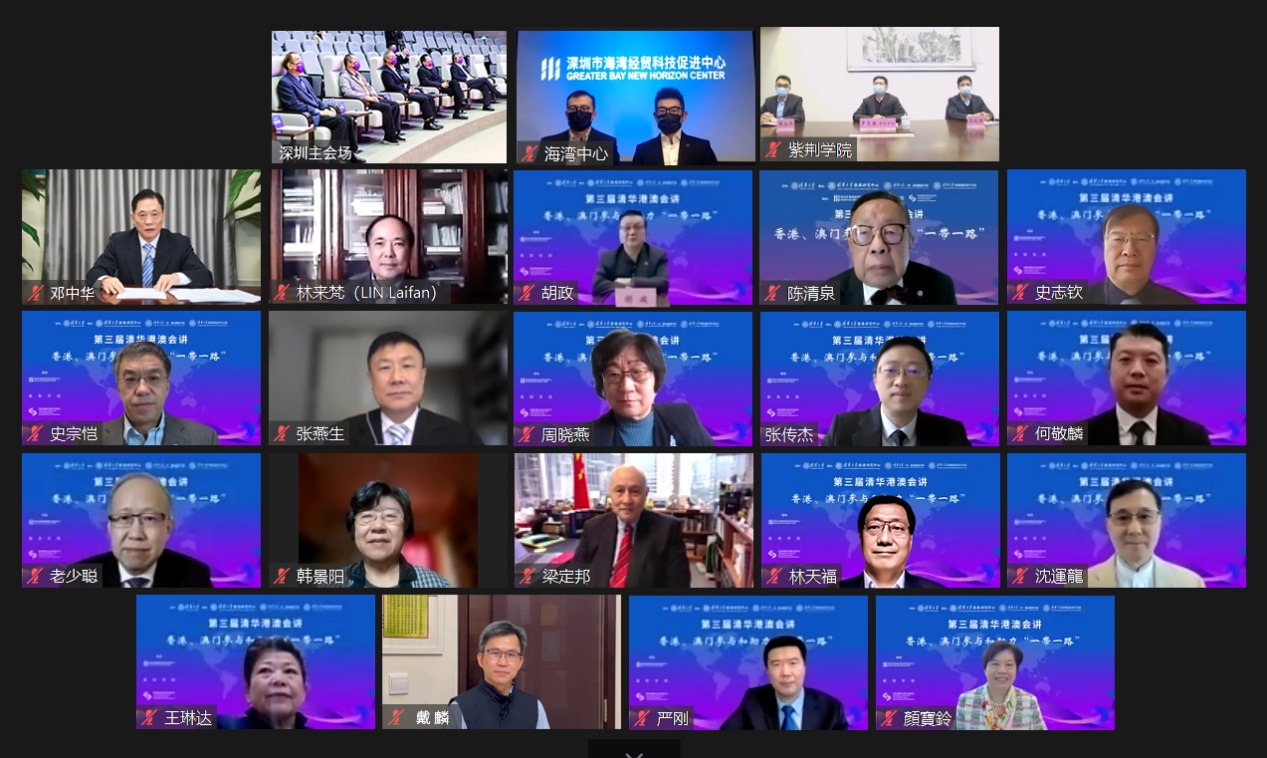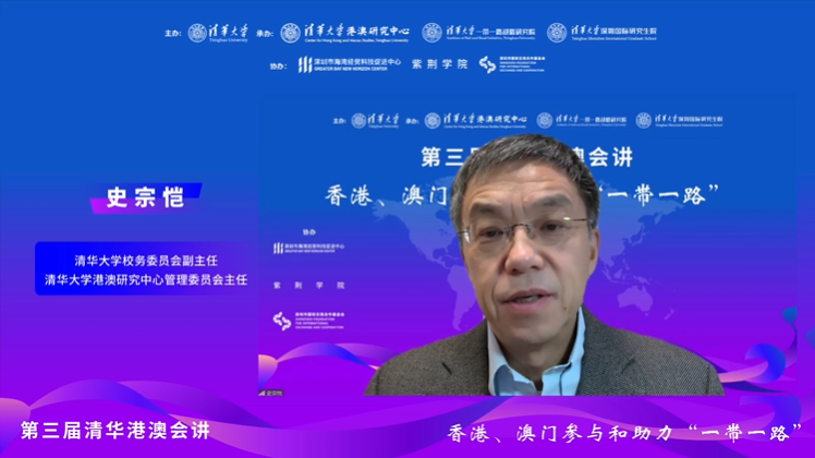 清华新闻网12月5日电 12月3日,由清华大学主办,清华大学港澳研究中心、清华大学一带一路战略研究院和清华大学深圳国际研究生院承办,深圳市海湾经贸科技促进中心、紫荆学院和深圳市国际交流合作基金会协办的第三届清华港澳会讲在线上举办。本届会讲活动以“香港、澳门参与和助力‘一带一路’”为主题,邀请来自内地和港澳有关专家学者以及在“一带一路”共建国家有丰富实践经验的港澳企业家作为主旨演讲嘉宾,共同探讨港澳如何发挥“背靠祖国”和“联通世界”的显著优势,更加积极地参与和助力“一带一路”。活动在清华大学深圳国际研究生院设主会场,在深圳市海湾经贸科技促进中心、紫荆学院设分会场。