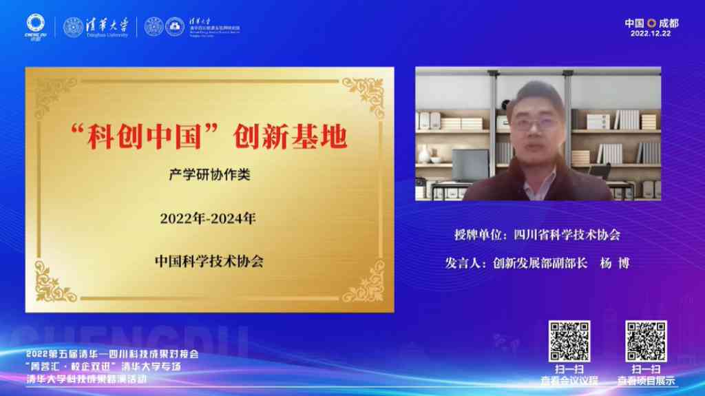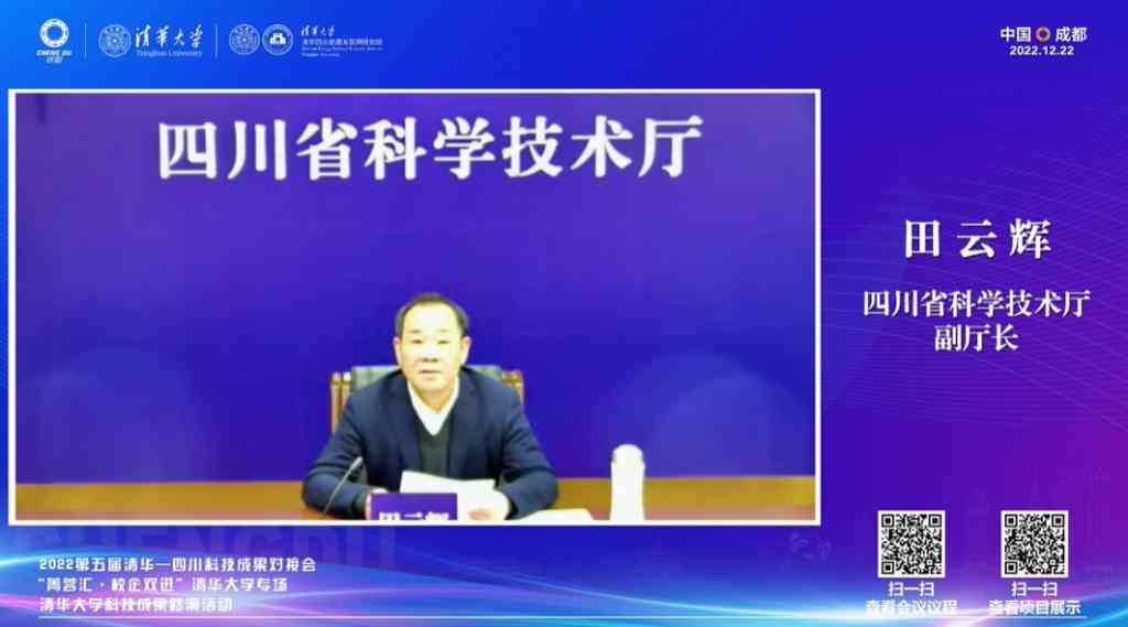 清华新闻网12月28日电 为进一步加强四川省与清华大学的全面深化合作,促进清华大学科技成果在川转移转化,12月22日,“2022第五届清华-四川科技成果对接会——‘菁蓉汇·校企双进’清华大学专场——清华大学科技成果路演活动”在线成功举办。清华大学副校长曾嵘、四川省科学技术厅副厅长田云辉、成都市科学技术局局长丁小斌出席会议并致辞。