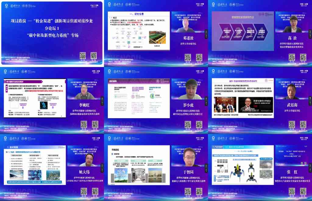 22日下午,“碳中和及新型电力系统”“创新技术与装备”两大分论坛开展“校企双进”创新项目供需对接沙龙,组织来自清华大学建筑学院、环境学院、电子系等院系以及清华大学合肥公共安全研究院、清华大学天津高端装备研究院、清华苏州环境创新研究院、清华海峡研究院、清华四川能源互联网研究院等派出院在内的15个创新项目进行线上路演。