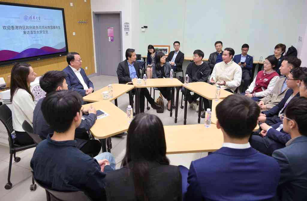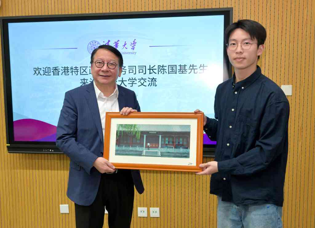 在与清华大学港籍学生代表座谈时,陈国基回顾了自己在清华求学的经历,围绕同学们在清华的学习和生活等情况进行了交流。陈国基表示,港籍学生在内地求学既能紧贴国家发展前沿,也能积极发掘把握庞大机遇。他鼓励清华港籍学生发挥好桥梁作用,向内地同学讲好香港故事,宣传在港发展的优势和机遇,助力香港引进更多高质量人才,希望同学们潜心学习专业知识,未来发挥自身所长,在各自领域服务国家发展大局,为国家和香港发展贡献力量。