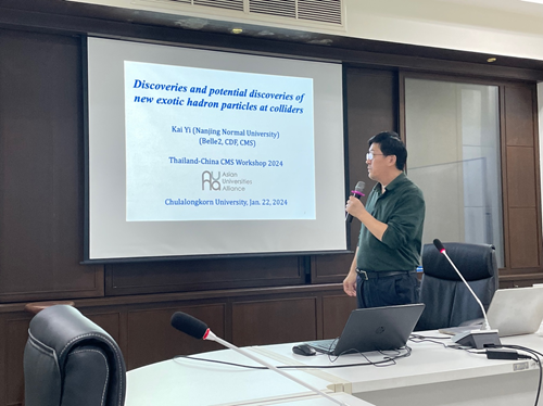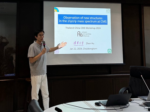 在1月19日的研讨会上,清华大学物理系博士生刘锦枫作题为“在J/ψJ/ψ衰变道观测到的新结构和J/ψJ/ψ截面测量”(Observation of new structure in the J/ψJ/ψ channel and measurement of J/ψJ/ψ cross section)的学术报告。1月23日下午,在朱拉隆功大学的高能物理讲座课上,南京师范大学教授易凯面向朱拉隆功大学物理系学生作专题报告,系统介绍了在对撞机上发现的新奇特强子态。随后,清华大学物理系副教授胡震作专题报告详细讲解了在CMS(紧凑型缪子螺线管)实验的双粲偶素质量谱上观测到的新结构。