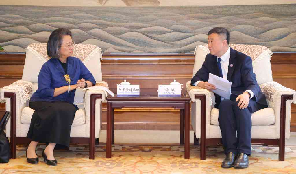 杨斌代表清华大学对阿里沙赫巴纳一行来访表示欢迎。他介绍了清华大学国际交流合作工作的有关情况,特别是近年来在推进全球战略和海外基地建设方面的努力与成效,以及服务亚太地区经济社会发展和教育交流合作的长期努力。他表示,清华大学始终坚定支持和参与联合国可持续发展目标(SDGs),希望未来双方在推动亚太区域合作、国际人才培养等方面开展更多合作,取得更多成果。