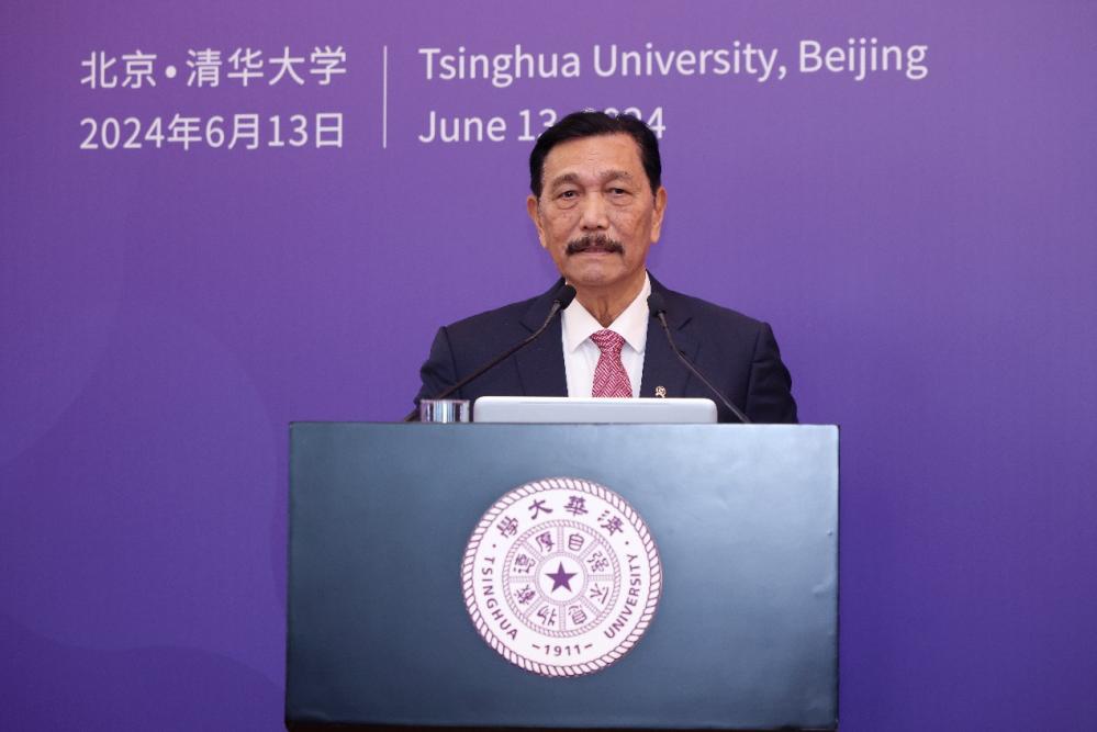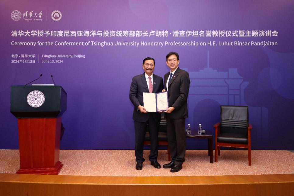 清华新闻网6月16日电(记者 李含 摄影 杨艳宾)6月13日,印度尼西亚海洋与投资统筹部长卢胡特·潘查伊坦访问清华大学。清华大学校长李路明在主楼与卢胡特进行会谈。卢胡特当天受聘成为清华大学名誉教授,并做客清华大学海外名师讲堂,发表了题为“印尼经济转型:2045年黄金印尼愿景”的主题演讲。