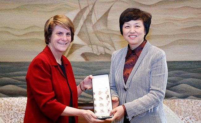 陈旭与辛蒂·杰布互赠纪念品 石加东 摄