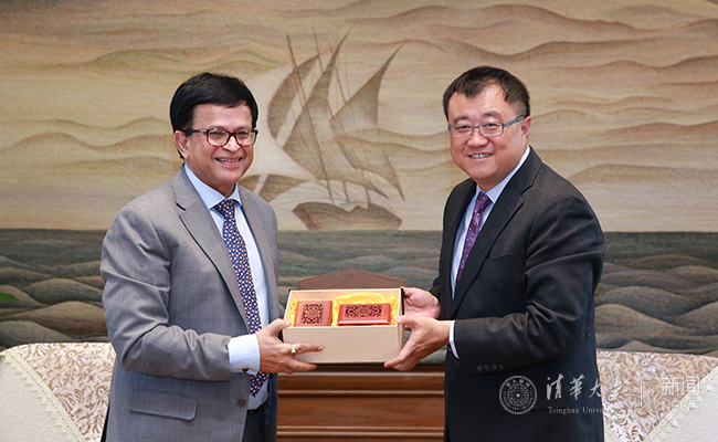 杨斌给尼基尔·塞斯一行赠送清华纪念品。 记者 苑洁 摄