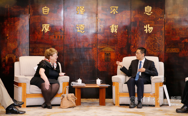 清华新闻网6月2日电(实习记者 李婧)5月31日,美国弗吉尼亚大学校长特蕾莎·苏利文(Teresa Sullivan)教授访问清华大学,并作客清华大学海外名师讲堂第201讲,发表了题为“大学如何为变革中的世界培养领袖”的演讲。清华大学副校长施一公在演讲前与苏利文教授进行了简短会谈。