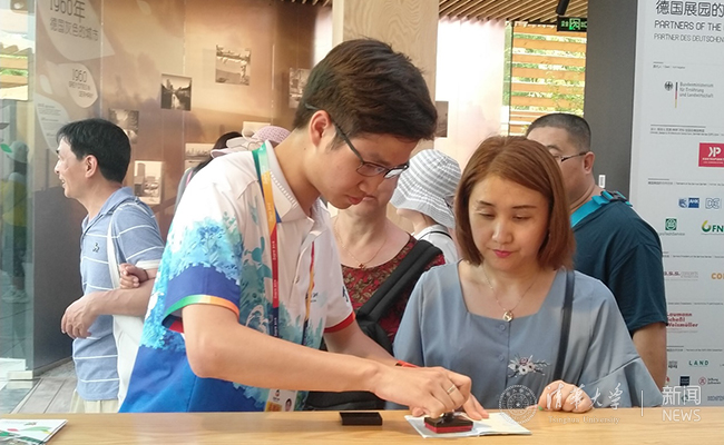 本次世园会清华志愿者队伍中还包括了10名来自韩国、西班牙、印度尼西亚等国的国际学生。来自韩国的经管学院学生郑惠英便是其中之一,她在韩国园负责引导游客,帮助展馆工作人员安排体验活动。郑惠英说,能加入这次世园会志愿者队伍感觉非常幸运,志愿中心也非常细心地将自己安排在韩国园,看到有更多的人通过世园会了解韩国文化感觉非常开心。