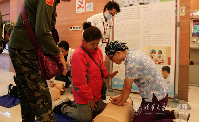 长庚医院心脏内科医师张鸥向患者讲解和演示了成人心肺复苏的要点,并由清华长庚医院的医生们指导有兴趣的患者进行了现场操作。第一步,呼叫病人,确认病人是否有意识;第二步,向就近的人员呼救,包括呼叫急救车,拿除颤仪等;第三步,判断病人是否有颈动脉搏动;第四步,进行胸外心脏按压,按压频率每分钟100-120次;第五步,30次心脏按压后进行2次口对口人工呼吸;第六步,持续2分钟后(约5个循环),再次判断患者的意识。学会如何判定心脏骤停以及如何进行徒手心肺复苏,可以第一时间对身边的朋友及亲人进行抢救,提高他们的生存率。