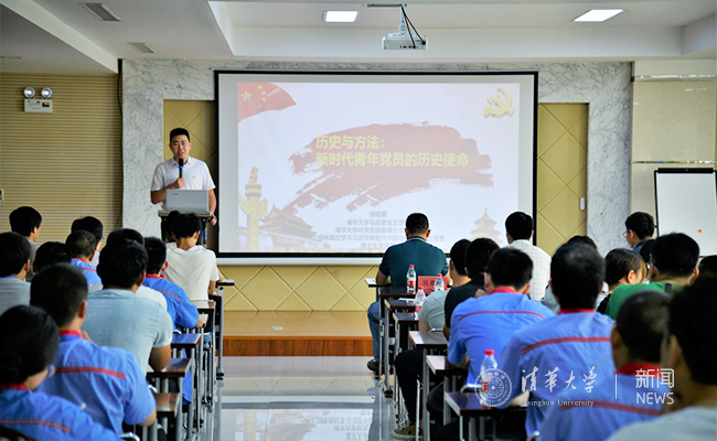 在天能集团,清华大学马克思主义学院2017级博士生徐铭拥从党的十九大报告认识的历史方位、马克思主义科学方法论等方面讲解新时代青年党员的历史使命。